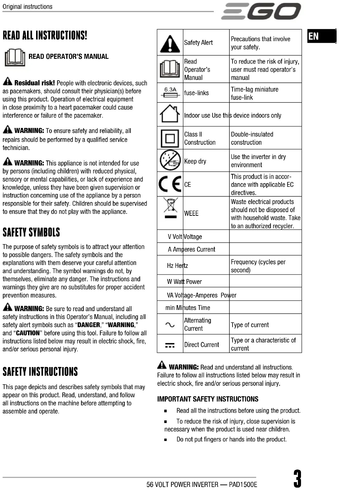 ◾ Read all the instructions before using the product. ◾ To reduce the risk of injury, close supervision is necessary when the product is used near children. ◾ Do not put fingers or hands into the product. Original instructions56 VOLT POWER INVERTER — PAD1500E4
