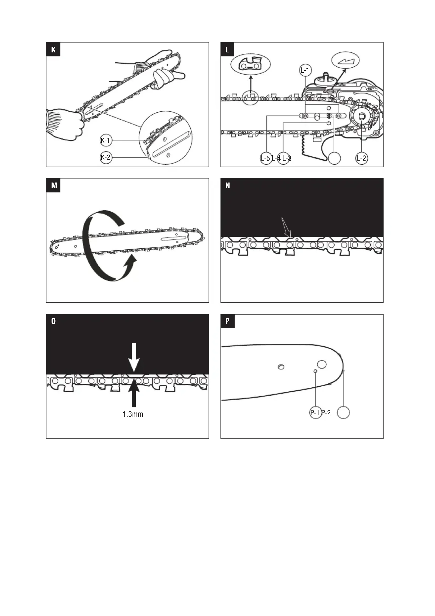 screw until the following points apply (Fig. N): ◾ Chain sag in the center of the bar is around:1.3mm (Fig. O). ◾ Wear gloves, ensure chain can be pulled along the bar smoothly with two fingers.