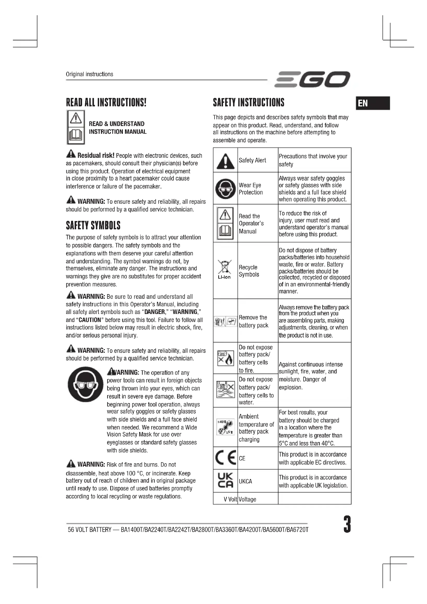 Download the instructions for your Battery in PDF format for free! Find your manual BA6720T - EGO and take your electronic device back in hand. On this page are published all the documents necessary for the use of your device. BA6720T by EGO.