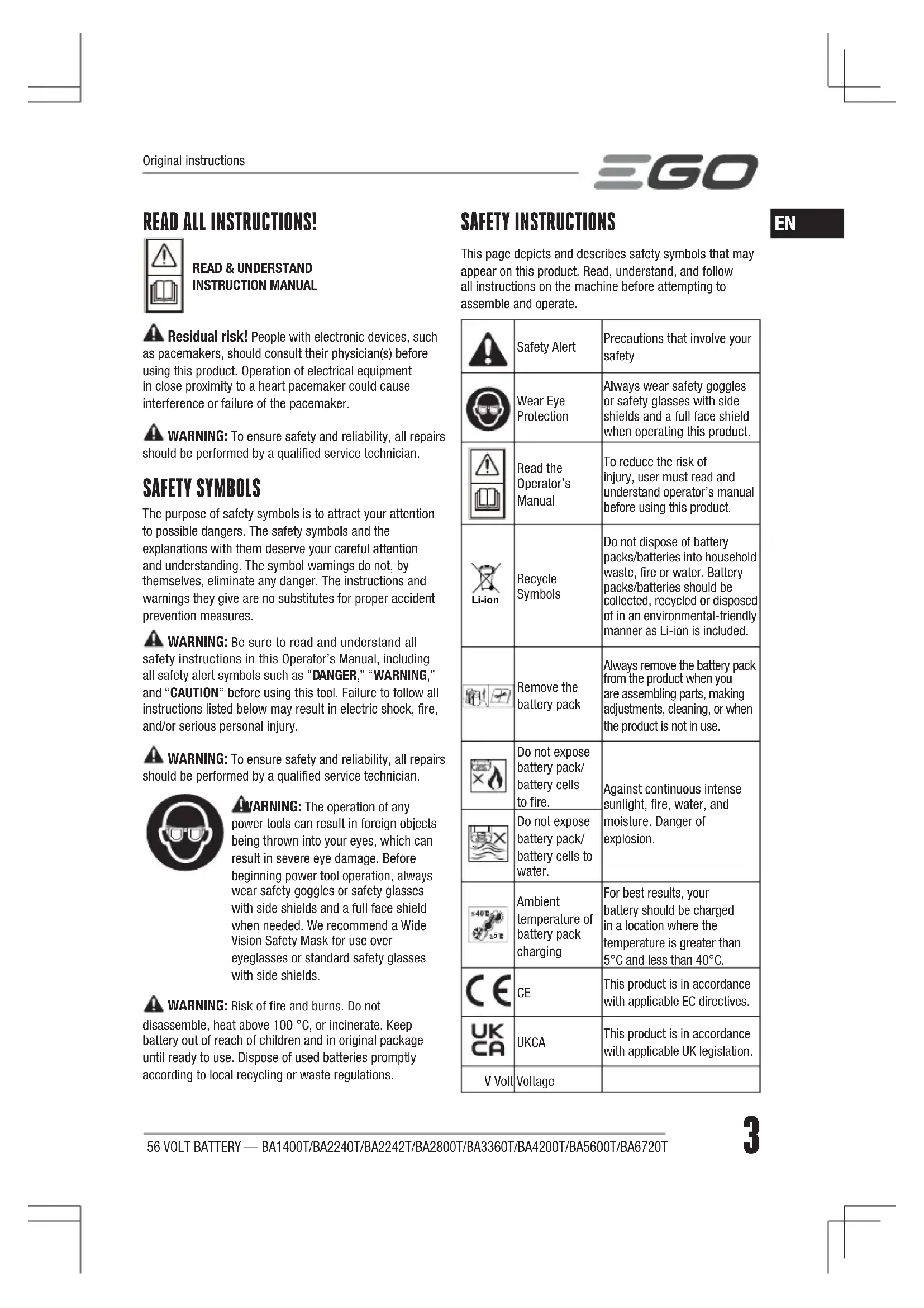 Please visit the website egopowerplus.eu for full terms and conditions of the EGO Warranty policy.10 56 VOLT AKKUMULATOR — BA1400T/BA2240T/BA2242T/BA2800T/ BA3360T/ BA4200T/BA5600T/BA6720T