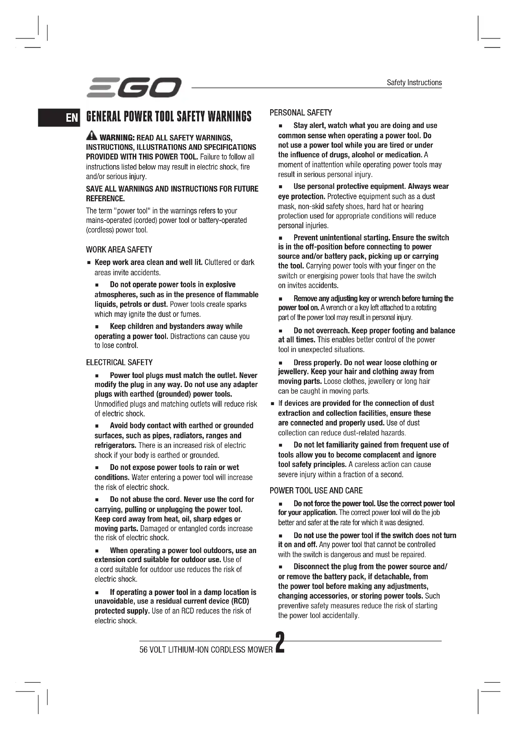 ◾ Do not force the power tool. Use the correct power tool for your application. The correct power tool will do the job better and safer at the rate for which it was designed. ◾ Do not use the power tool if the switch does not turn it on and off. Any power tool that cannot be controlled with the switch is dangerous and must be repaired. ◾ Disconnect the plug from the power source and/ or remove the battery pack, if detachable, from the power tool before making any adjustments, changing accessories, or storing power tools. Such preventive safety measures reduce the risk of starting the power tool accidentally.Safety Instructions56 VOLT LITHIUM-ION CORDLESS MOWER 3