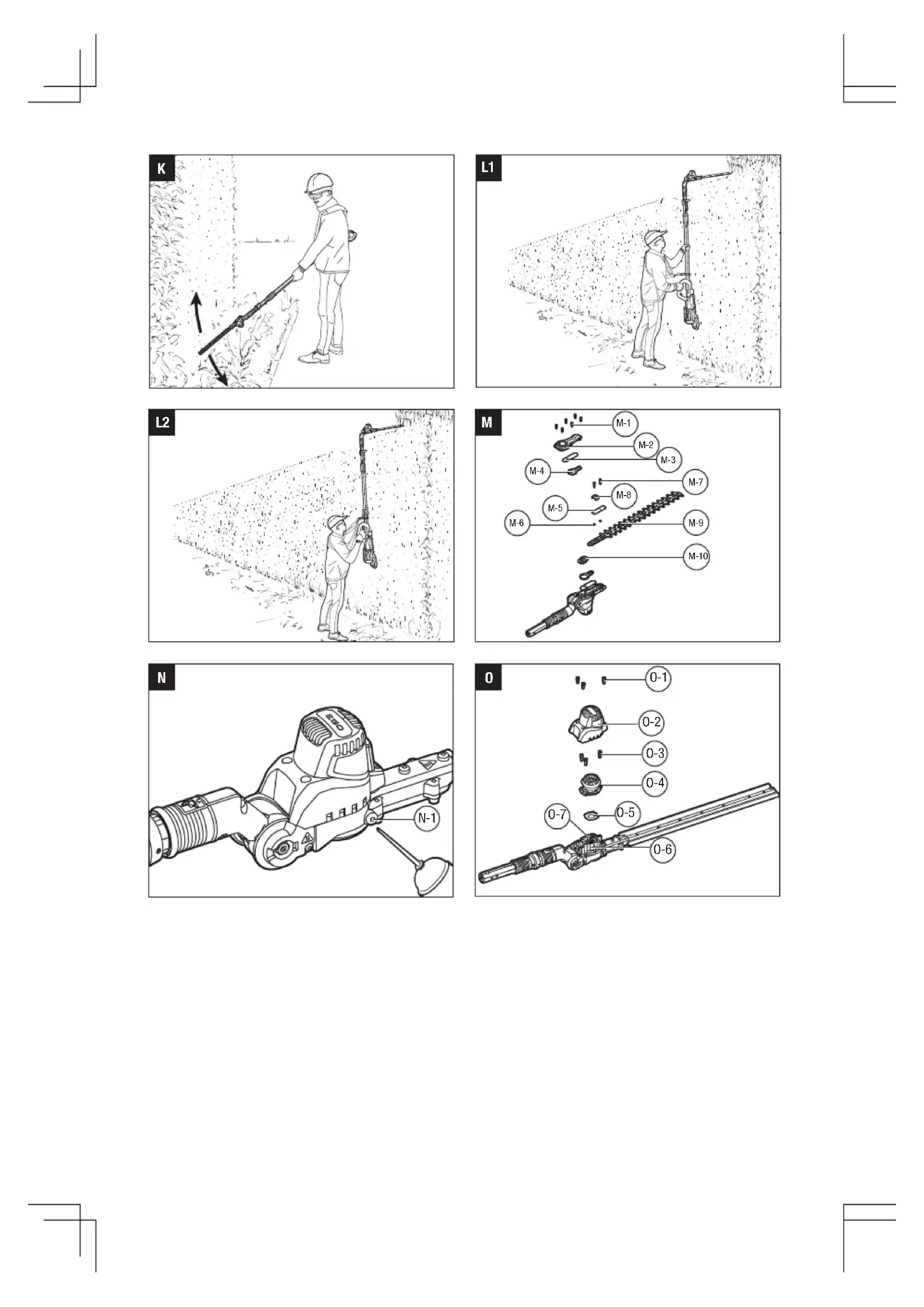 the extended-reach hedge trimmer. Hold the extended- reach hedge trimmer with both hands to avoid loss of control. Following the instructions in the section “HOLDING THE TELESCOPIC POWER POLE” in PPX1000 operator’s manual WORKING TECHNIQUES Horizontal Cutting (with cutting head at an angle) Cut close to the ground from a standing position, e.g. for trimming low shrubs. Swing the cutting head right and left as you move along the hedge-use both sides of the blades and do not rest the cutter blade on the ground (Fig. H) Horizontal Cutting (with straight cutting head) Hold the cutting head at an angle of 0°as you slowly swing the hedge trimmer horizontally. Swing the cutting head in an arc towards the outsides of the hedge so that the cuttings are swept to the ground (Fig. I). Recommendation: Cut hedges that are no more than chest height in this working position. Vertical Cutting (cutting head at an angle) Cutting without standing directly next to the hedge, e.g. owerbed between operator and hedge. In this cutting position, for your better control of the hedge trimmer, it is recommended that connect the hedge trimmer with the cutting head at the side cutting position. Swing the cutting head up and down in an arc as you move along the hedge – use both sides of the cutting blade (Fig. J). Vertical Cutting (with straight cutting head) Extra long reach without the need for other aids. Swing the cutting head up and down in an arc as you move along the hedge – use both sides of the cutting blade (Fig. k). Overhead Cutting (with cutting head at an angle) Hold the hedge trimmer vertically and swing it in an arc to make maximum use of its reach (Fig. L1&L2). For extreme high hedge, the extension pole is suitable for aids in trimming.