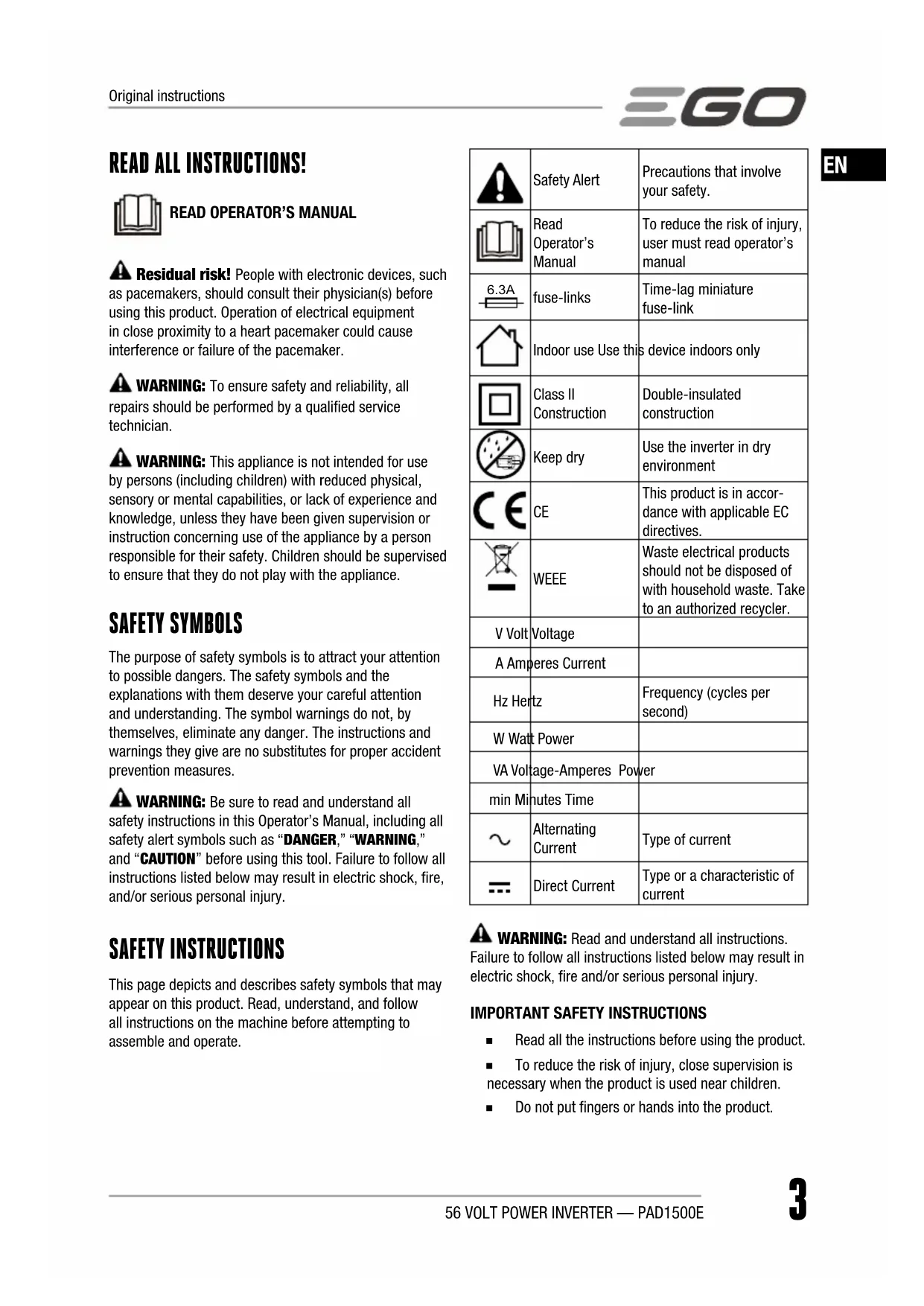 ◾ Read all the instructions before using the product. ◾ To reduce the risk of injury, close supervision is necessary when the product is used near children. ◾ Do not put fingers or hands into the product. Original instructions56 VOLT POWER INVERTER — PAD1500E4