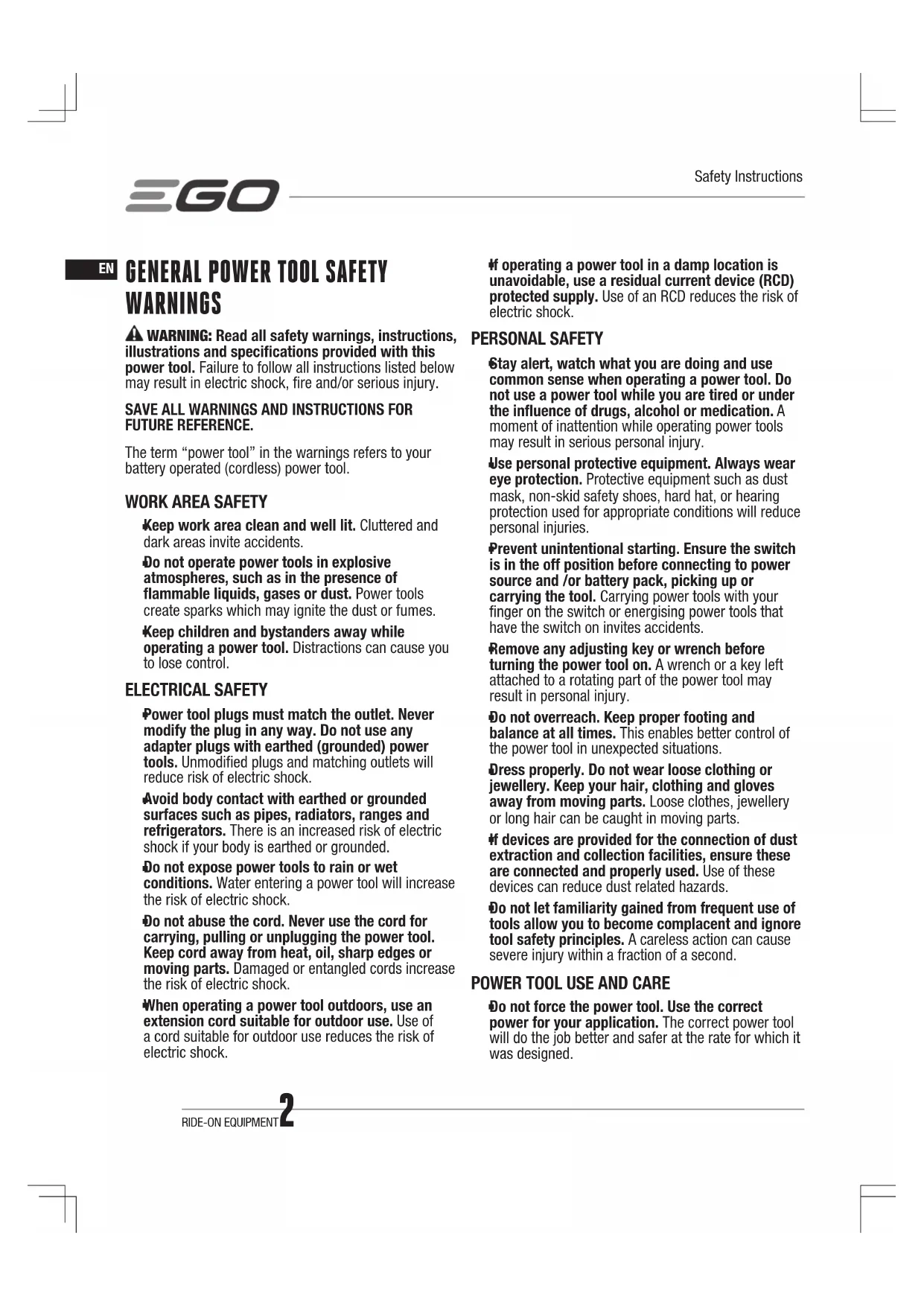 Do not force the power tool. Use the correct power for your application. The correct power tool will do the job better and safer at the rate for which it was designed. Safety Instructions3RIDE-ON EQUIPMENT