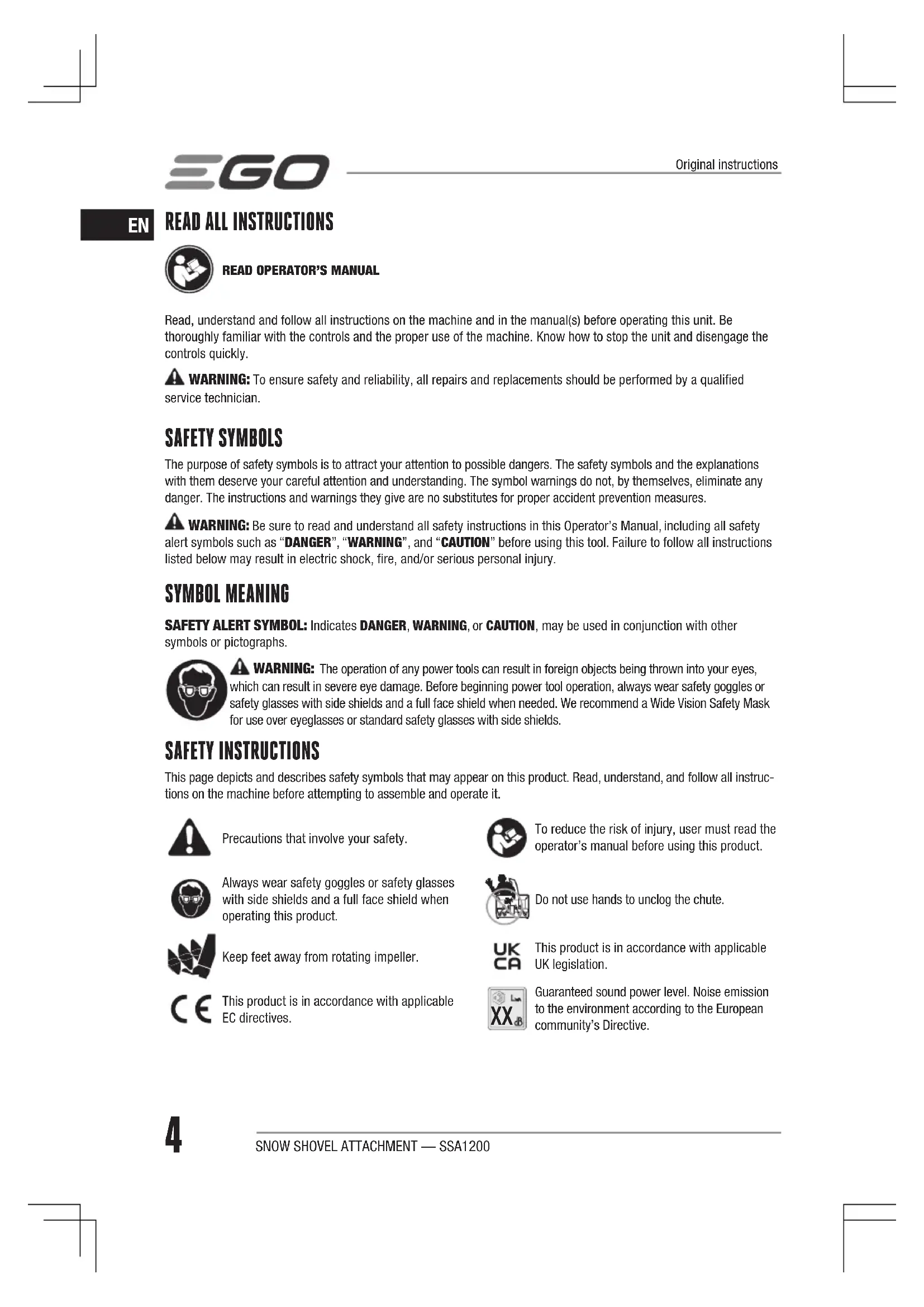 which can result in severe eye damage. Before beginning power tool operation, always wear safety goggles or safety glasses with side shields and a full face shield when needed. We recommend a Wide Vision Safety Mask for use over eyeglasses or standard safety glasses with side shields. SAFETY INSTRUCTIONS This page depicts and describes safety symbols that may appear on this product. Read, understand, and follow all instruc- tions on the machine before attempting to assemble and operate it.Precautions that involve your safety.To reduce the risk of injury, user must read the operator’s manual before using this product.Always wear safety goggles or safety glasses with side shields and a full face shield when operating this product.Do not use hands to unclog the chute.Keep feet away from rotating impeller.This product is in accordance with applicable UK legislation.This product is in accordance with applicable EC directives.