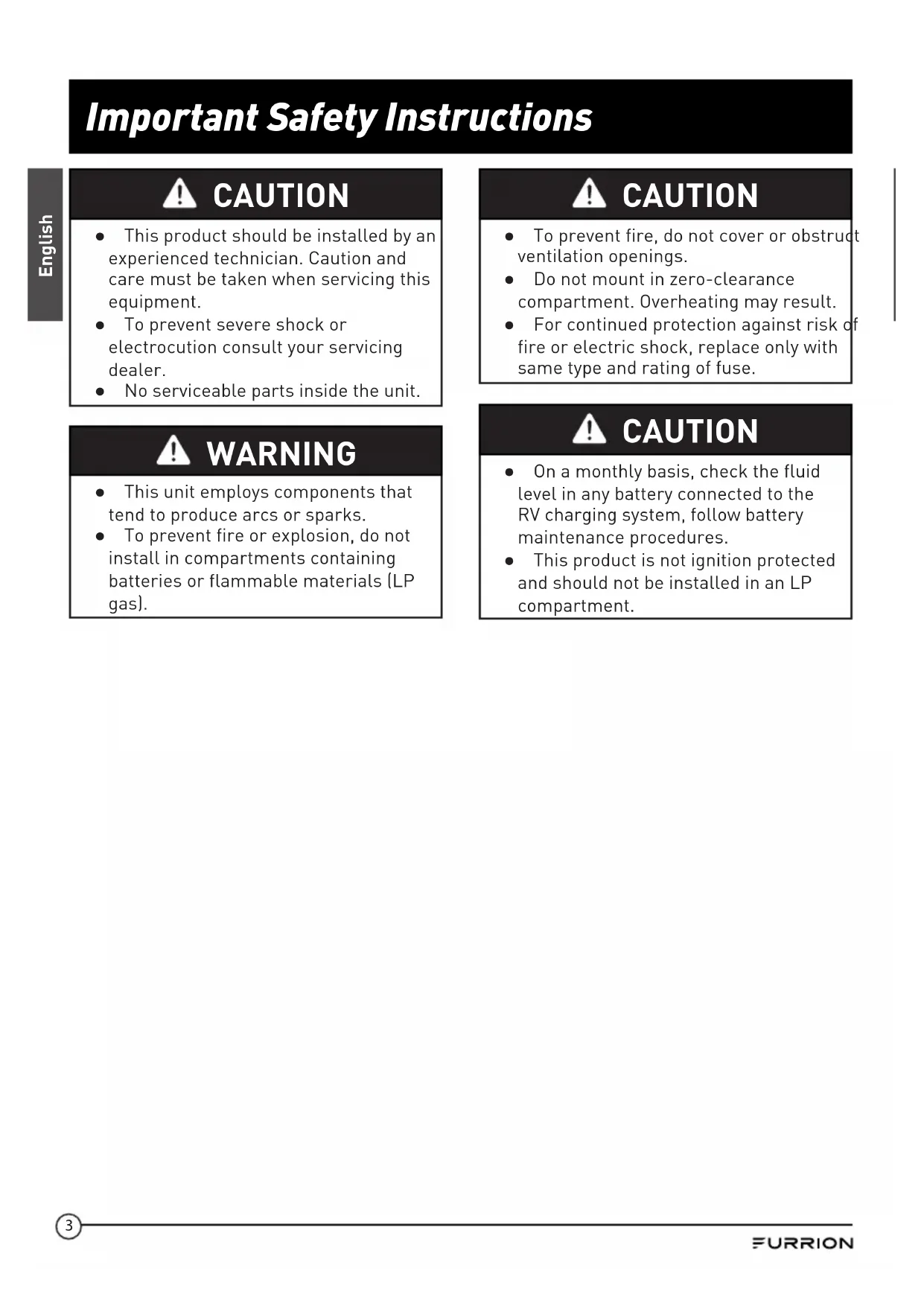 - Warranty Important Safety Instructions English CAUTION ● This product should be installed by an experienced technician. Caution and care must be taken when servicing this equipment. ● To prevent severe shock or electrocution consult your servicing dealer. ● No serviceable parts inside the unit. WARNING ● This unit employs components that tend to produce arcs or sparks. ● To prevent fire or explosion, do not install in compartments containing batteries or flammable materials (LP gas). CAUTION ● To prevent fire, do not cover or obstruct ventilation openings. ● Do not mount in zero-clearance compartment. Overheating may result. ● For continued protection against risk of fire or electric shock, replace only with same type and rating of fuse. CAUTION ● On a monthly basis, check the fluid level in any battery connected to the RV charging system, follow battery maintenance procedures. ● This product is not ignition protected and should not be installed in an LP compartment.4 Product Overview English ● AC and DC distribution panel with max 30A/12V 15 DC distribution and 12 AC branch circuits. ● Easy installation and removal of AC wiring strain relief. ● Simple minimalist design. ● Can be used with Furrion FCVSDC60A/ FCVSDC80A 12V series converter. ● Reverse polarity protection by fuse. Rear View Front View Breaker Cover DC Output5 Installation English This product is not ignition protected and should not be installed in an LP compartment. For proper wire sizes and torque requirements, refer to the label on the back of the door assembly. WARNING This unit employs components that tend to produce arcs or sparks. To prevent fire or explosion, do not install in compartments containing batteries or flammable materials (LP gas). CAUTION ● To prevent fire, do not cover or obstruct ventilation openings. Do not mount in zero-clearance compartment. Overheating may result. ● For continued protection against risk of fire or electric shock, replace only with same type and ratings of fuse. What’s in the Box Make sure you have all the following items included in the packaging. If any items are damaged or missing, contact your dealer. − Distribution Panel x 1 − Instruction Manual x 1 − Warranty Card x 1 Mounting the Distribution Panel Consult a licensed electrician or an RV technician for installation assistance. p. 123