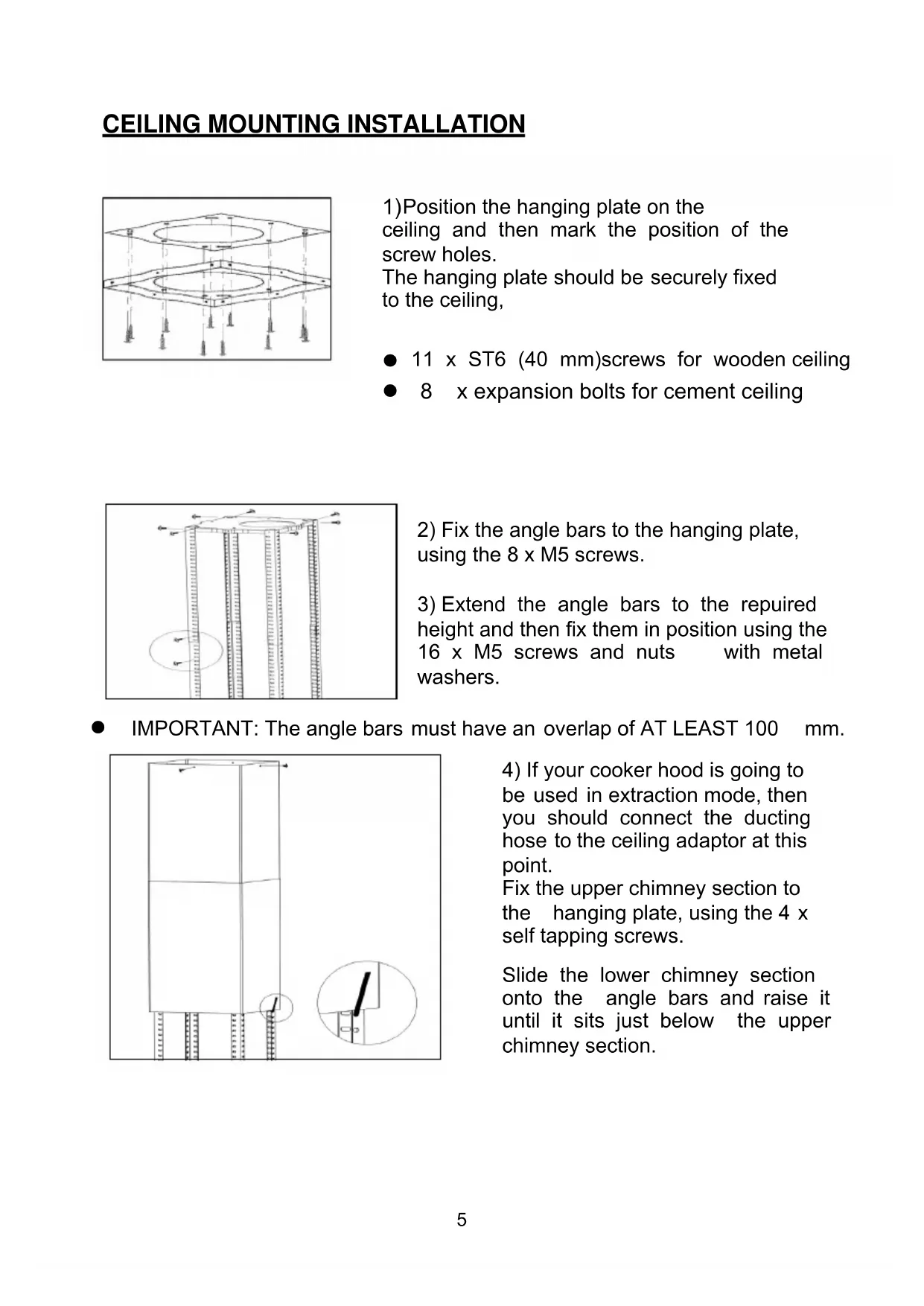 be used in extraction mode, then you should connect the ducting hose to the ceiling adaptor at this point. Fix the upper chimney section to the hanging plate, using the 4 x self tapping screws. Slide the lower chimney section onto the angle bars and raise it until it sits just below the upper chimney section.