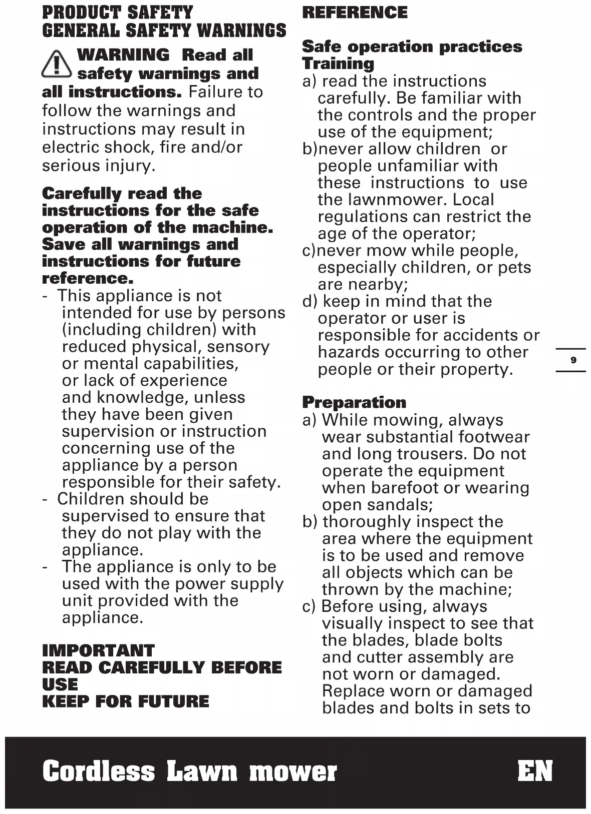 REFERENCE Safe operation practices Training a) read the instructions carefully. Be familiar with the controls and the proper use of the equipment; b)never allow children or people unfamiliar with these instructions to use the lawnmower. Local regulations can restrict the age of the operator; c)never mow while people, especially children, or pets are nearby; d) keep in mind that the operator or user is responsible for accidents or hazards occurring to other people or their property. Preparation a) While mowing, always wear substantial footwear and long trousers. Do not operate the equipment when barefoot or wearing open sandals; b) thoroughly inspect the area where the equipment is to be used and remove all objects which can be thrown by the machine; c) Before using, always visually inspect to see that the blades, blade bolts and cutter assembly are not worn or damaged. Replace worn or damaged blades and bolts in sets to10 Cordless Lawn mower EN preserve balance. Replace damaged and unreadable labels. Operation a) mow only in daylight or in good artificial light; b) avoid operating the equipment in wet grass, where feasible; c) always be sure of your footing on slopes; d) walk, never run; e) for wheeled rotary machines, mow across the face of slopes, never up and down;mow across the face of slopes, never up and down. f) exercise extreme caution when changing direction on slopes; g) do not mow excessively steep slopes; h) use extreme caution when reversing or pulling the lawnmower towards you;