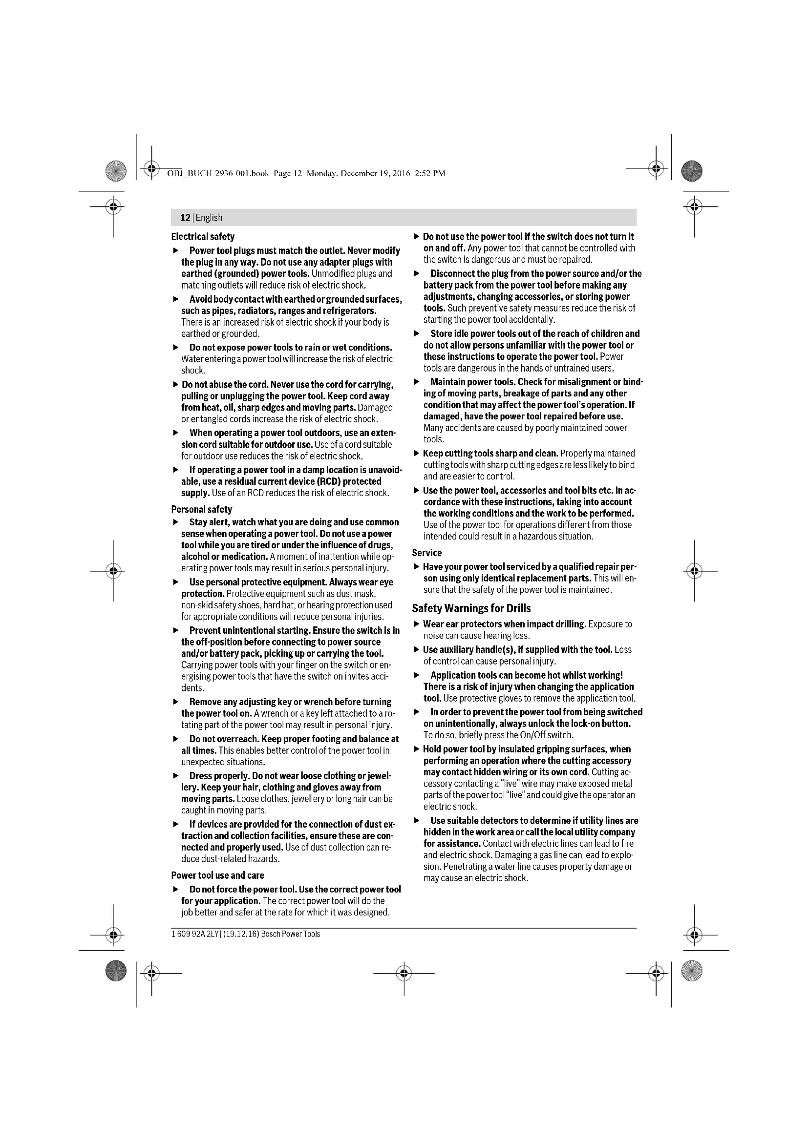 ) (see figure D) The drill spindle is locked when the On/Off switch 6 is not pressed. This makes quick, convenient and easy changing of the tool in the drill chuck possible. Open the keyless chuck 1 by turning in rotation direction , until the tool can be inserted. Insert the tool. Firmly tighten the collar of the keyless chuck 1 by hand in ro- tation direction until the locking action (“click”) is no longer heard. This automatically locks the chuck. The locking is released again to remove the tool when the col- lar is turned in the opposite direction. Screwdriver Tools When working with screwdriver bits 15, a universal bit holder 14 should always be used. Use only screwdriver bits that fit the screw head. For driving screws, always position the “Drilling/Impact Drill- ing” selector switch 3 to the “Drilling” symbol. Replacing the Drill Chuck Before any work on the machine itself, pull the mains plug. Removing the Drill Chuck (see figure E) Remove the auxiliary handle 10. Insert a steel pin with a diameter of Ø 4 mm and approx. 50 mm of length into the drill hole on the spindle neck in order to lock the drill spindle. Clamp the short end of a hex key 16 into the keyless chuck 1. Place the machine on a stable surface (e. g. a workbench). Hold the machine firmly and loosen the keyless chuck 1 by turning the hex key 16 in rotation direction . Loosen a tight- seated keyless chuck by giving the long end of the hex key 16 a light blow. Remove the hex key from the keyless chuck and completely unscrew the keyless chuck. Mounting the Drill Chuck (see figure F) The keyless chuck is mounted in reverse order. Remove the steel pin from the drill hole on the spindle neck after mounting is completed. The drill chuck must be tightened with a tightening torque of approx. 30–35 Nm. Operation Starting Operation Observe correct mains voltage! The voltage of the pow- er source must agree with the voltage specified on the nameplate of the machine. Power tools marked with 230 V can also be operated with 220 V. Reversing the rotational direction (see figure G) The rotational direction switch 4 is used to reverse the rota- tional direction of the machine. However, this is not possible with the On/Off switch 6 actuated. Right Rotation: For drilling and driving in screws, push the rotational direction switch 4 left to the stop. Left Rotation: For loosening and unscrewing screws and nuts, press the rotational direction switch 4 through to the right stop. Setting the operating mode Drilling and Screwdriving Set the selector switch 3 to the “Drilling” symbol. Impact drilling Set the selector switch 3 to the “Impact drilling” symbol. The selector switch 3 engages noticeably and can also be ac- tuated with the machine running. OBJ_BUCH-2936-001.book Page 15 Monday, December 19, 2016 2:52 PM16 | English 1 609 92A 2LY | (19.12.16) Bosch Power Tools Switching On and Off To start the machine, press the On/Off switch 6 and keep it pressed. To lock the pressed On/Off switch 6, press the lock-on button