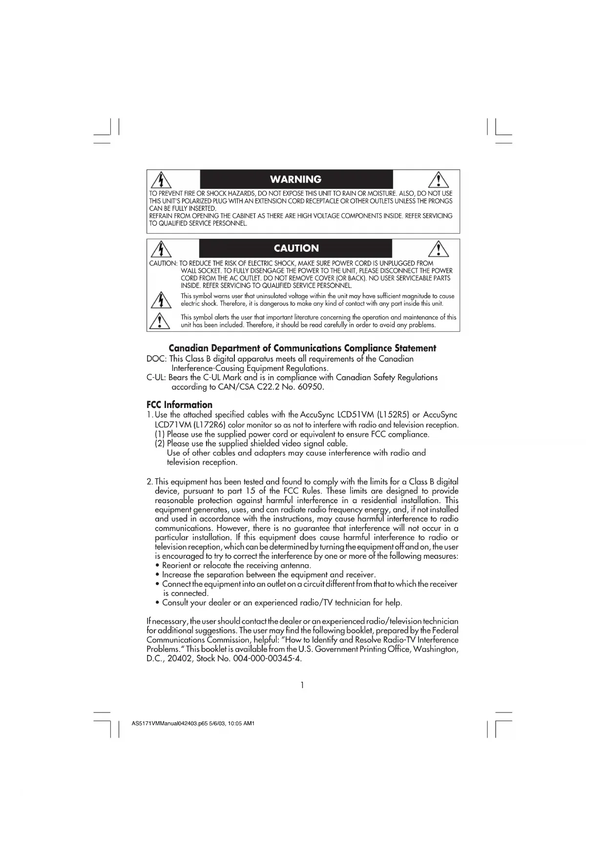 Use the attached specified cables with the AccuSync LCD51VM (L152R5) or AccuSync LCD71VM (L172R6) color monitor so as not to interfere with radio and television reception. (1) Please use the supplied power cord or equivalent to ensure FCC compliance. (2) Please use the supplied shielded video signal cable. Use of other cables and adapters may cause interference with radio and television reception.