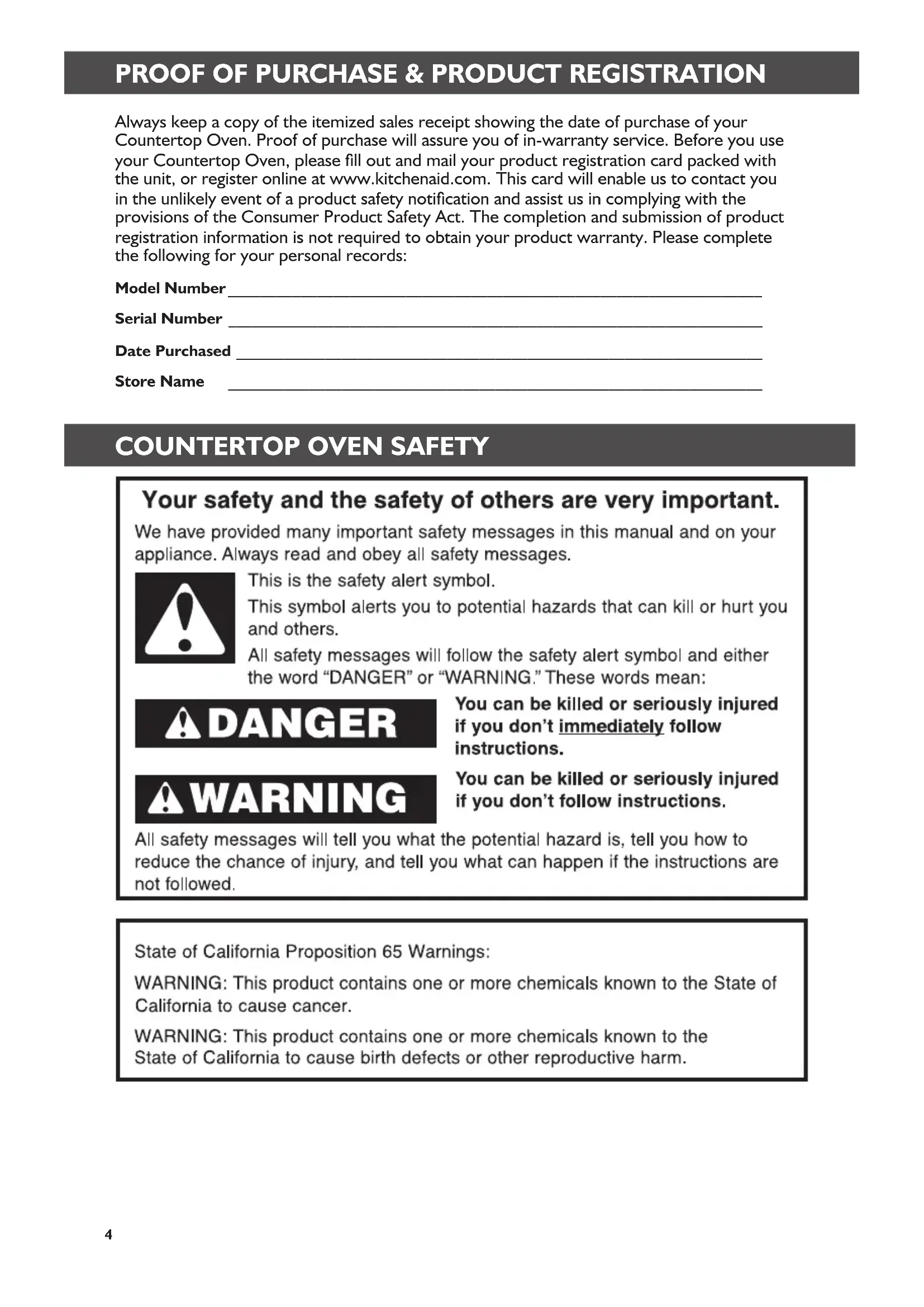Model Number __________________________________________________________________ Serial Number __________________________________________________________________ Date Purchased _________________________________________________________________ Store Name __________________________________________________________________ Always keep a copy of the itemized sales receipt showing the date of purchase of your Countertop Oven. Proof of purchase will assure you of in-warranty service. Before you use your Countertop Oven, please ll out and mail your product registration card packed with the unit, or register online at www.kitchenaid.com. This card will enable us to contact you in the unlikely event of a product safety notication and assist us in complying with the provisions of the Consumer Product Safety Act. The completion and submission of product registration information is not required to obtain your product warranty. Please complete the following for your personal records: W10760897C_ENv02.indd 4 5/12/15 11:32 AM5 English