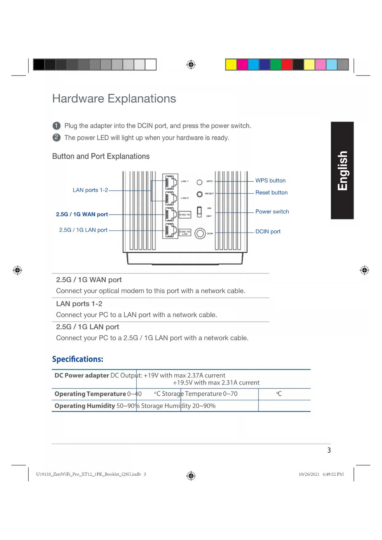 Plug the adapter into the DCIN port, and press the power switch. The power LED will light up when your hardware is ready. Button and Port Explanations 2.5G / 1G WAN port Connect your optical modem to this port with a network cable. LAN ports 1-2 Connect your PC to a LAN port with a network cable.DC Power adapter DC Output: +19V with max 2.37A current +19.5V with max 2.31A currentOperating Temperature 0~40 C Storage Temperature 0~70