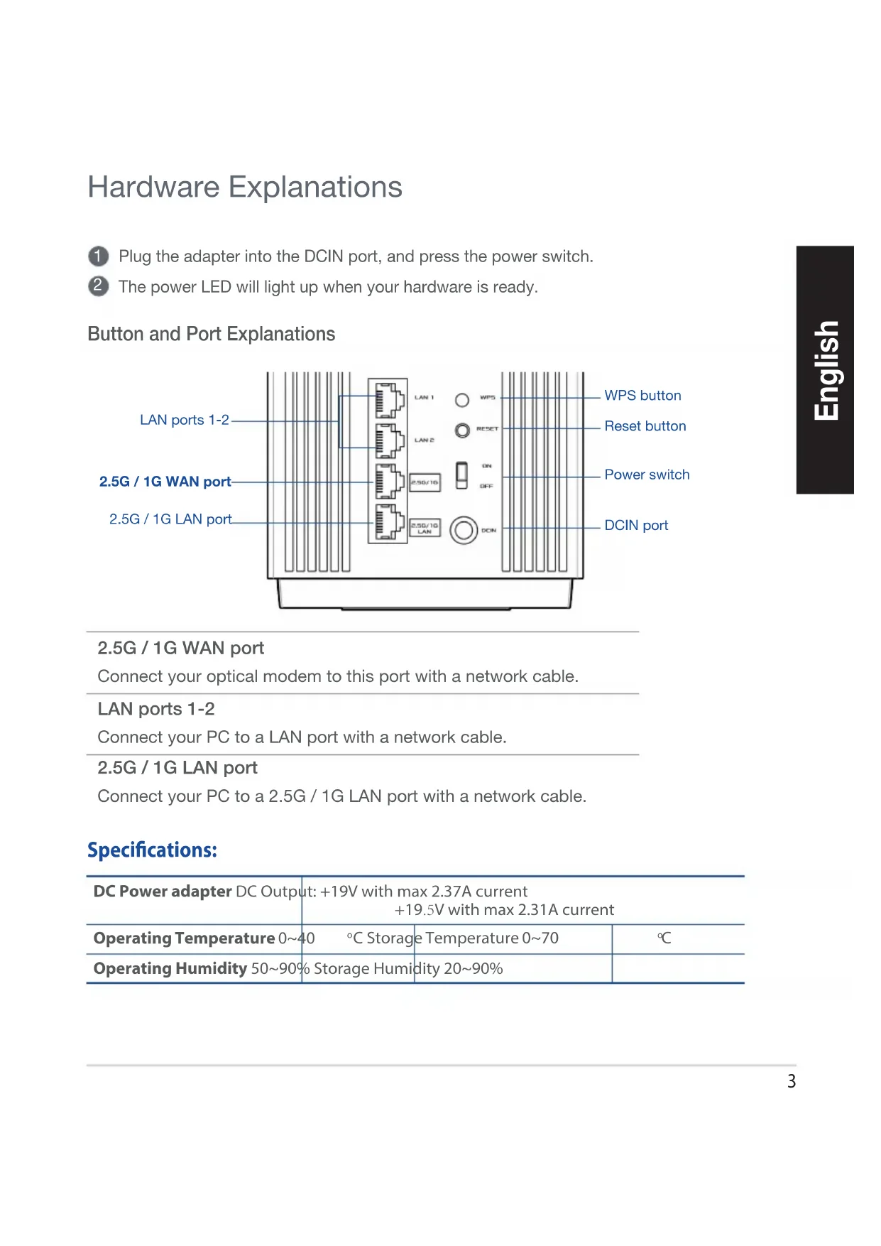Operating Humidity 50~90% Storage Humidity 20~90% Specications: LAN ports 1-2WPS buttonReset buttonPower switchDCIN port 2.5G / 1G LAN port Connect your PC to a 2.5G / 1G LAN port with a network cable.2.5G / 1G WAN port2.5G / 1G LAN port4 English Before Setup Setting up a standalone router