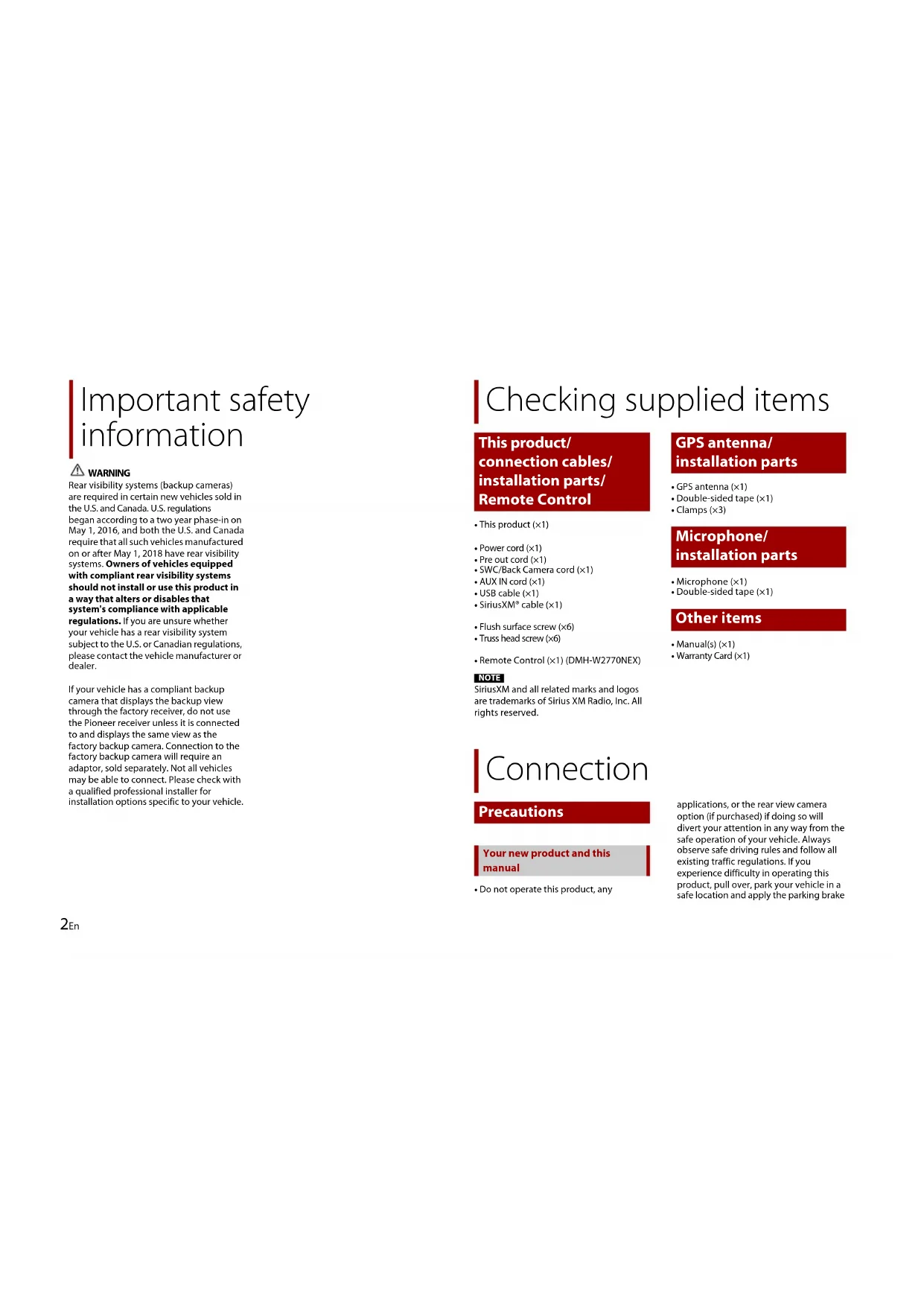 - This product (×1)• Power cord (×1)• Pre out cord (×1)• SWC/Back Camera cord (×1)• AUX IN cord (×1)• USB cable (×1)• SiriusXM® cable (×1)• Flush surface screw (×6)• Truss head screw (×6)• Remote Control (×1) (DMH-W2770NEX) NOTE SiriusXM and all related marks and logos are trademarks of Sirius XM Radio, Inc. All rights reserved.• GPS antenna (×1)• Double-sided tape (×1)• Clamps (×3)• Microphone (×1)• Double-sided tape (×1)• Manual(s) (×1)• Warranty Card (×1)• Do not operate this product, any applications, or the rear view camera option (if purchased) if doing so will divert your attention in any way from the safe operation of your vehicle. Always observe safe driving rules and follow all existing traffic regulations. If you experience difficulty in operating this product, pull over, park your vehicle in a safe location and apply the parking brake Checking supplied items This product/ connection cables/ installation parts/ Remote Control GPS antenna/ installation parts Microphone/ installation parts Other items Connection Precautions Your new product and this manual3En English before making the necessary adjustments.