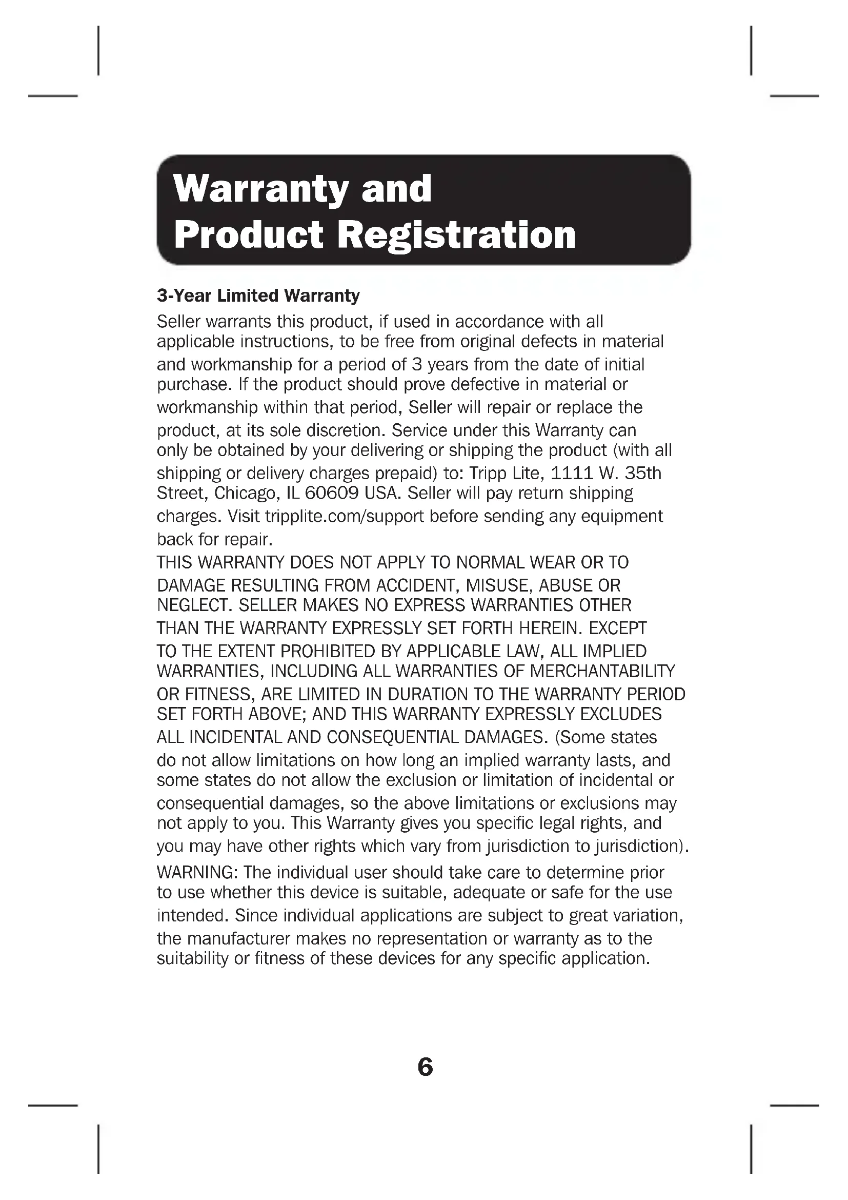 to use whether this device is suitable, adequate or safe for the use intended. Since individual applications are subject to great variation, the manufacturer makes no representation or warranty as to the suitability or fitness of these devices for any specific application.7 Warranty and Product Registration PRODUCT REGISTRATION Visit tripplite.com/warranty today to register your new Tripp Lite product. You’ll be automatically entered into a drawing for a chance to win a FREE Tripp Lite product!*