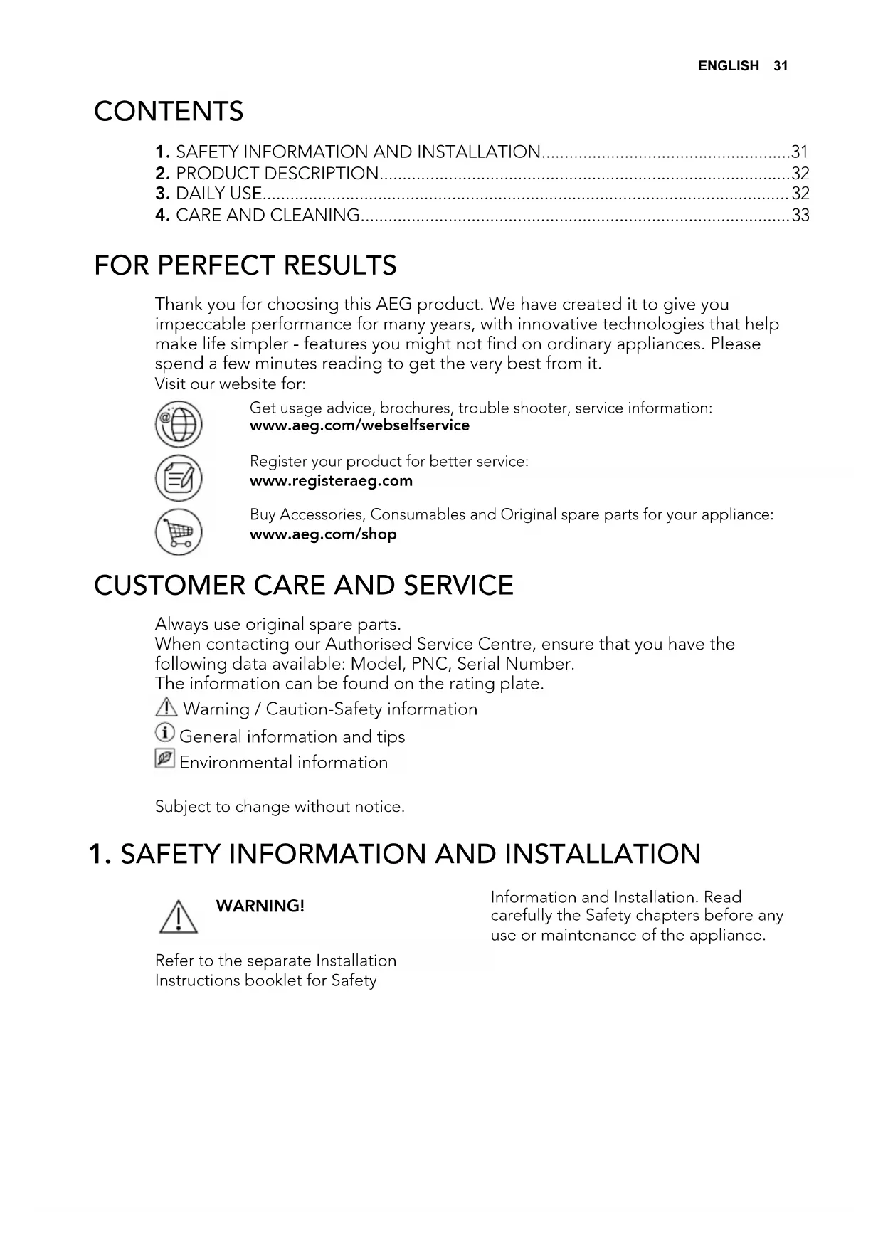 Thank you for choosing this AEG product. We have created it to give you impeccable performance for many years, with innovative technologies that help make life simpler - features you might not find on ordinary appliances. Please spend a few minutes reading to get the very best from it. Visit our website for: Get usage advice, brochures, trouble shooter, service information: www.aeg.com/webselfservice Register your product for better service: www.registeraeg.com Buy Accessories, Consumables and Original spare parts for your appliance: www.aeg.com/shop