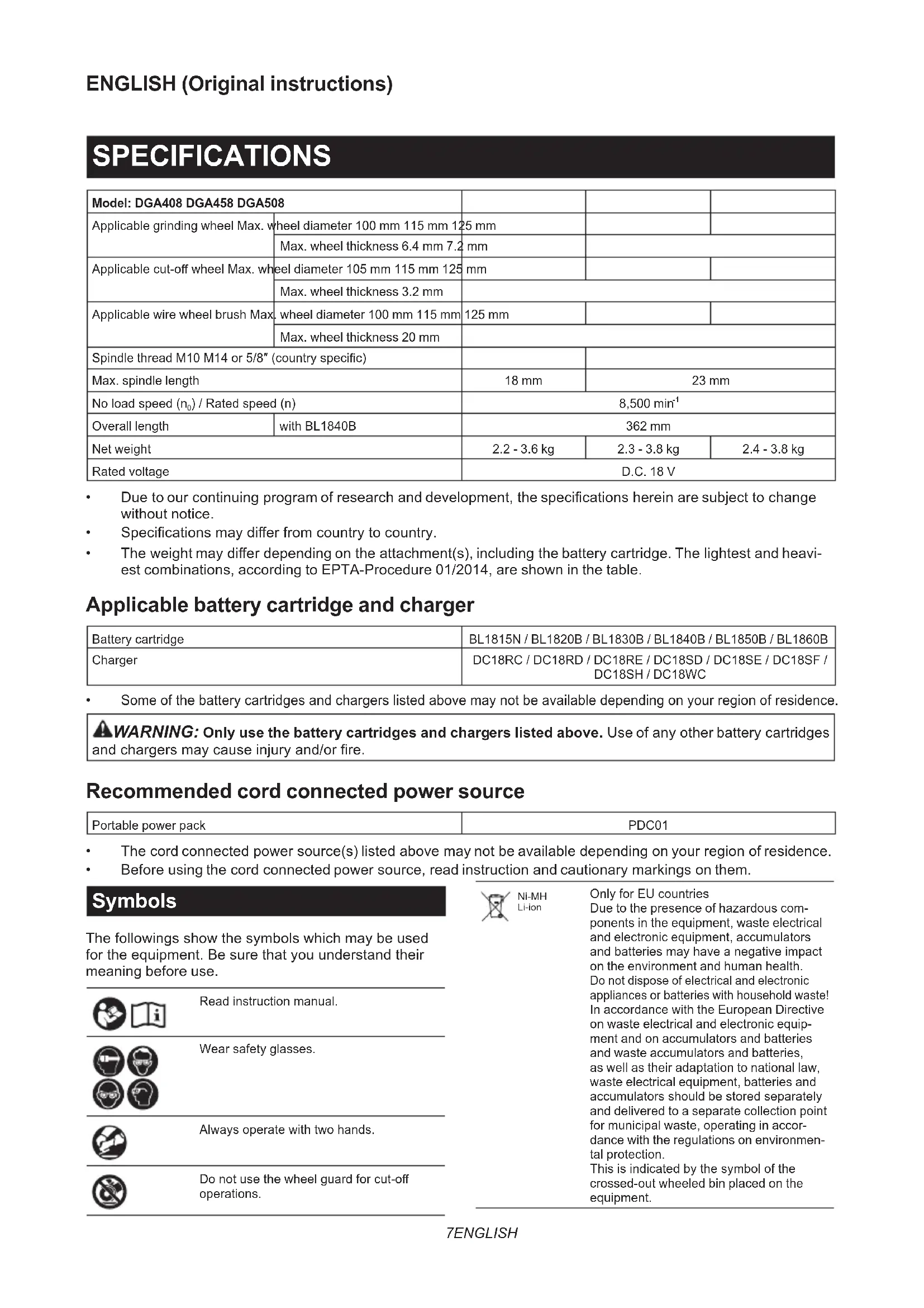 - Before using the cord connected power source, read instruction and cautionary markings on them. Symbols The followings show the symbols which may be used for the equipment. Be sure that you understand their meaning before use. Read instruction manual. Wear safety glasses. Always operate with two hands. Do not use the wheel guard for cut-o operations. Ni-MH Li-ion Only for EU countries Due to the presence of hazardous com- ponents in the equipment, waste electrical and electronic equipment, accumulators and batteries may have a negative impact on the environment and human health. Do not dispose of electrical and electronic appliances or batteries with household waste! In accordance with the European Directive on waste electrical and electronic equip- ment and on accumulators and batteries and waste accumulators and batteries, as well as their adaptation to national law, waste electrical equipment, batteries and accumulators should be stored separately and delivered to a separate collection point for municipal waste, operating in accor- dance with the regulations on environmen- tal protection. This is indicated by the symbol of the crossed-out wheeled bin placed on the equipment.8 ENGLISH Intended use The tool is intended for grinding, sanding, wire brushing, hole cutting and cutting of metal and stone materials without the use of water. Noise The typical A-weighted noise level determined according to EN62841-2-3: Model Sound pressure level (L