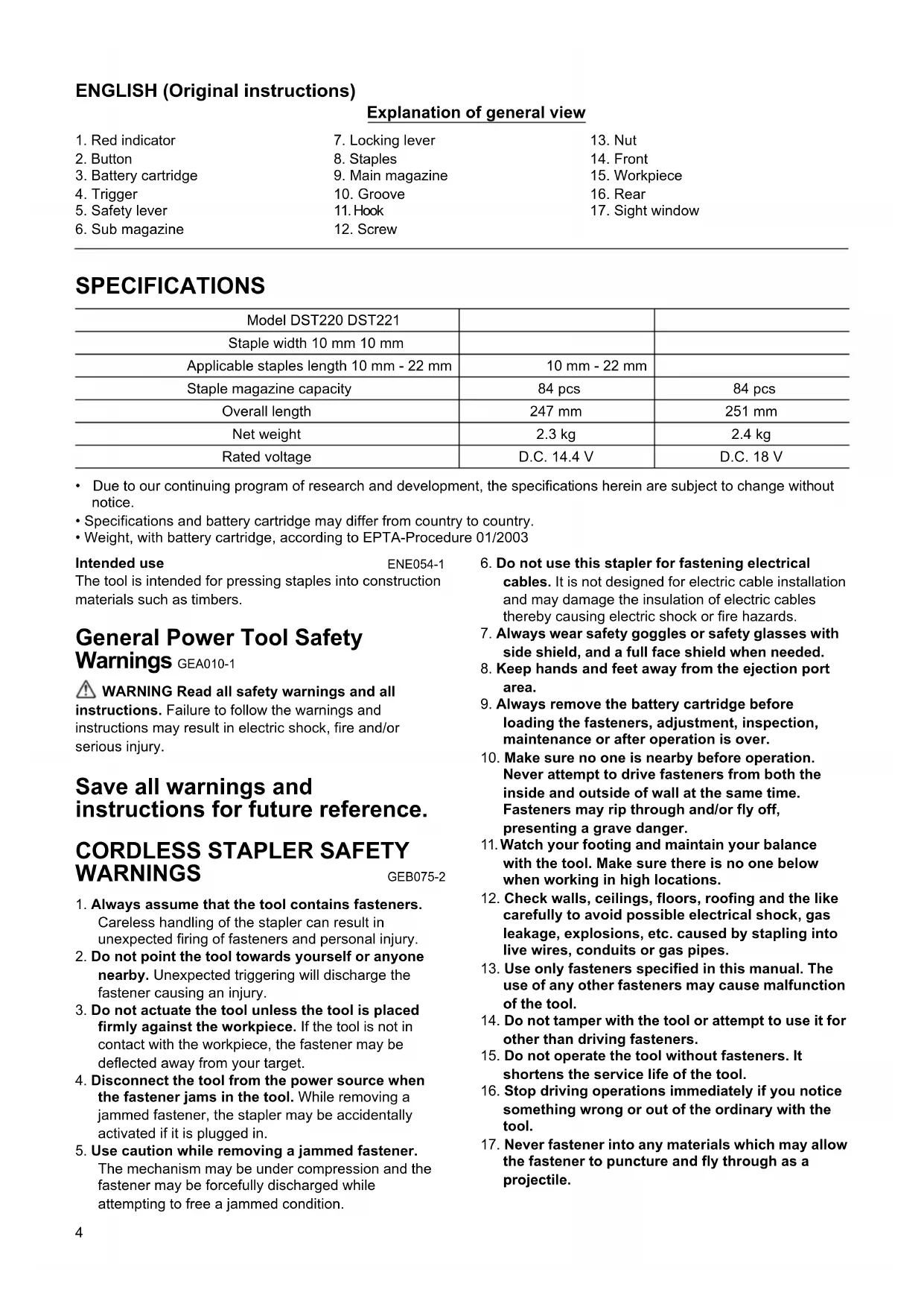 - Weight, with battery cartridge, according to EPTA-Procedure 01/2003 Intended use ENE054-1 The tool is intended for pressing staples into construction materials such as timbers. General Power Tool Safety Warnings GEA010-1 WARNING Read all safety warnings and all instructions. Failure to follow the warnings and instructions may result in electric shock, fire and/or serious injury. Save all warnings and instructions for future reference.