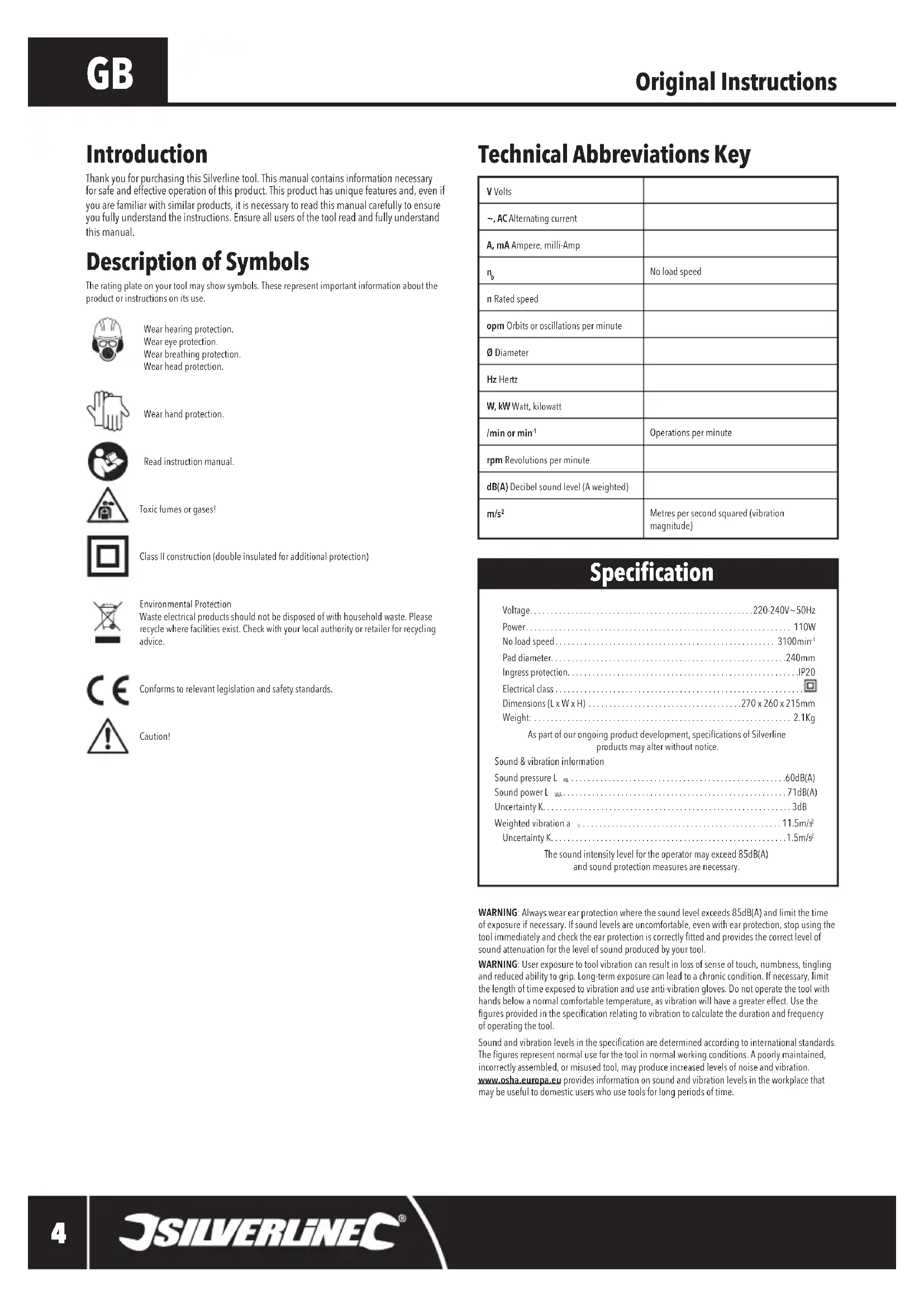 and reduced ability to grip. Long-term exposure can lead to a chronic condition. If necessary, limit the length of time exposed to vibration and use anti-vibration gloves. Do not operate the tool with hands below a normal comfortable temperature, as vibration will have a greater effect. Use the gures provided in the specication relating to vibration to calculate the duration and frequency of operating the tool. Sound and vibration levels in the specication are determined according to international standards. The gures represent normal use for the tool in normal working conditions. A poorly maintained, incorrectly assembled, or misused tool, may produce increased levels of noise and vibration. www.osha.europa.eu provides information on sound and vibration levels in the workplace that may be useful to domestic users who use tools for long periods of time. Description of Symbols The rating plate on your tool may show symbols. These represent important information about the product or instructions on its use.Wear hearing protection. Wear eye protection. Wear breathing protection.Wear head protection.Wear hand protection.Read instruction manual.Toxic fumes or gases!Class II construction (double insulated for additional protection)Environmental Protection Waste electrical products should not be disposed of with household waste. Please recycle where facilities exist. Check with your local authority or retailer for recycling advice.Conforms to relevant legislation and safety standards.Caution!V Volts~, AC Alternating currentA, mA Ampere, milli-Amp