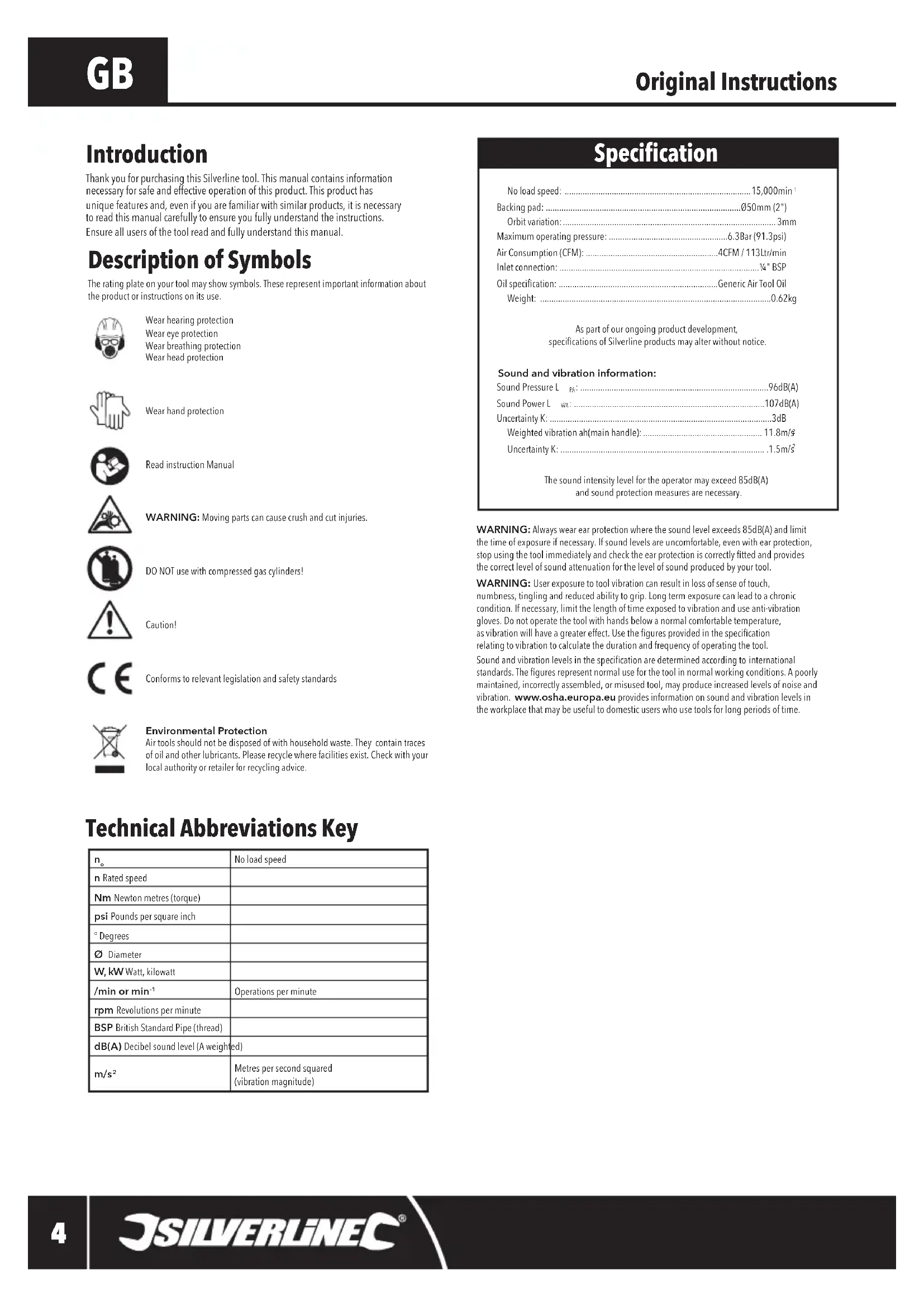 Sound and vibration levels in the specification are determined according to international standards. The figures represent normal use for the tool in normal working conditions. A poorly maintained, incorrectly assembled, or misused tool, may produce increased levels of noise and vibration. www.osha.europa.eu provides information on sound and vibration levels in the workplace that may be useful to domestic users who use tools for long periods of time.