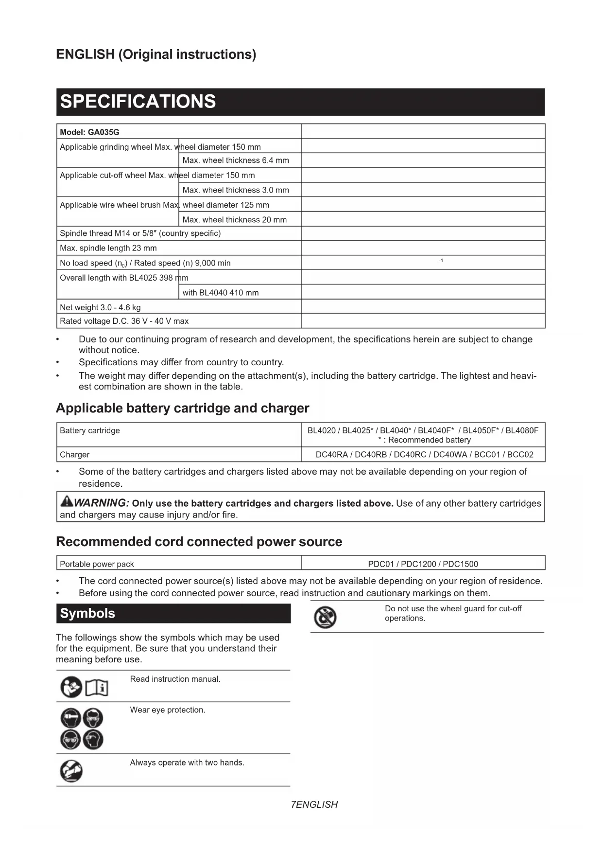 - Before using the cord connected power source, read instruction and cautionary markings on them. Symbols The followings show the symbols which may be used for the equipment. Be sure that you understand their meaning before use. Read instruction manual. Wear eye protection. Always operate with two hands. Do not use the wheel guard for cut-o operations.8 ENGLISH Ni-MH Li-ion Only for EU countries Due to the presence of hazardous com- ponents in the equipment, waste electrical and electronic equipment, accumulators and batteries may have a negative impact on the environment and human health. Do not dispose of electrical and electronic appliances or batteries with household waste! In accordance with the European Directive on waste electrical and electronic equip- ment and on accumulators and batteries and waste accumulators and batteries, as well as their adaptation to national law, waste electrical equipment, batteries and accumulators should be stored separately and delivered to a separate collection point for municipal waste, operating in accor- dance with the regulations on environmen- tal protection. This is indicated by the symbol of the crossed-out wheeled bin placed on the equipment. Intended use The tool is intended for grinding, sanding, wire brush- ing, hole cutting and cutting of metal and stone materi- als without the use of water. Noise The typical A-weighted noise level determined according to EN62841-2-3: Model Sound pressure level (L