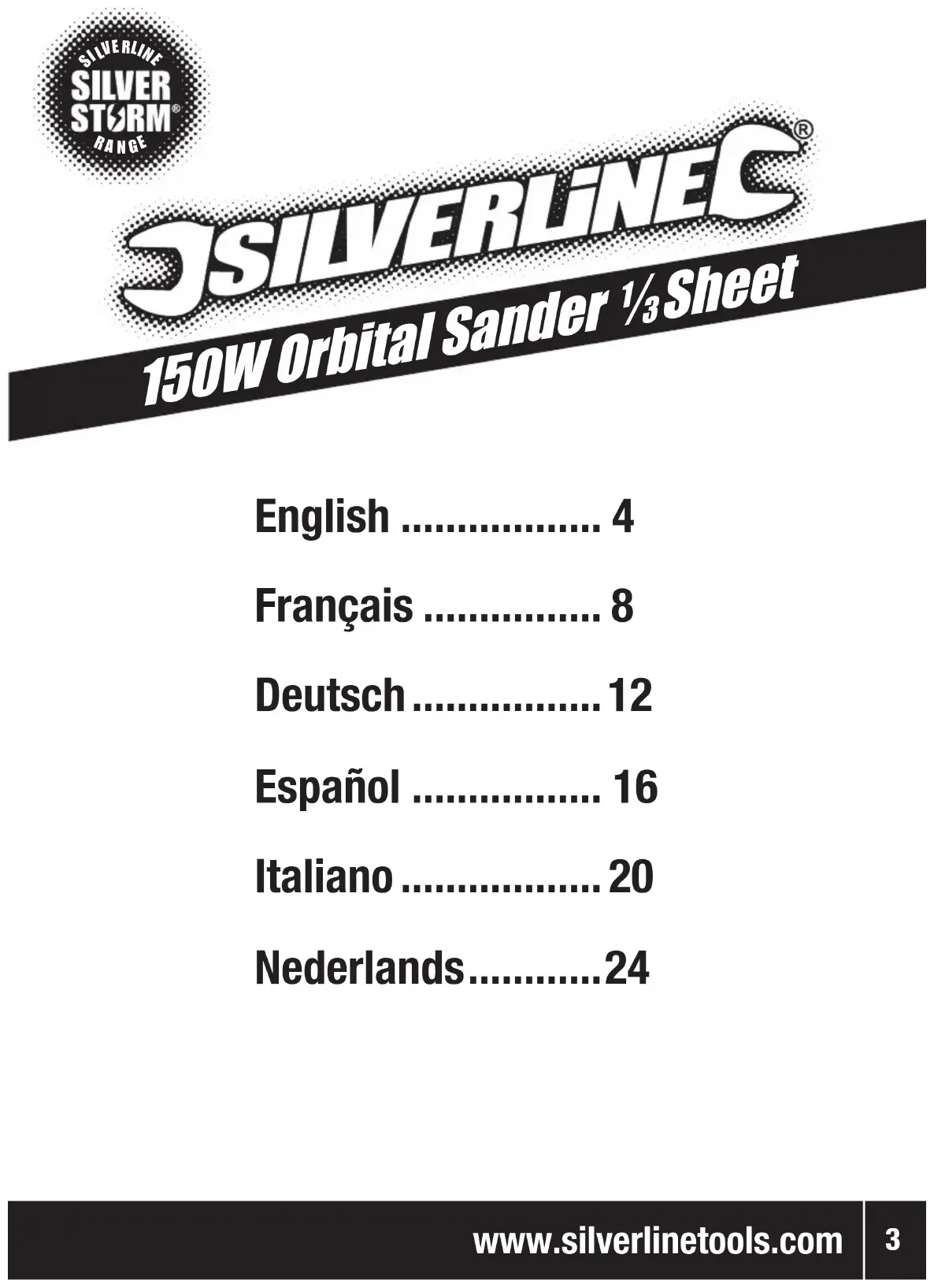 If this product develops a fault within 30 days of purchase, return it to the stockist where it was purchased, with your receipt, stating details of the fault. You will receive a replacement or refund.If this product develops a fault after the 30 day period, return it to:Silverline Tools Service Centre PO Box 2988 Yeovil BA21 1WU, UKThe guarantee claim must be submitted during the guarantee period.You must provide the original sales receipt indicating the purchase date, your name, address and place of purchase before any work can be carried out.You must provide precise details of the fault requiring correction.Claims made within the guarantee period will be verified by Silverline Tools to establish if the deficiencies are related to material or manufacturing of the product.Carriage will not be refunded. Items for return must be in a suitably clean and safe state for repair, and should be packaged carefully to prevent damage or injury during transportation. We may reject unsuitable or unsafe deliveries.All work will be carried out by Silverline Tools or its authorized repair agents.The repair or replacement of the product will not extend the period of guaranteeDefects recognised by us as being covered by the guarantee shall be corrected by means of repair of the tool, free of charge (excluding carriage charges) or by replacement with a tool in perfect working order.Retained tools, or parts, for which a replacement has been issued, will become the property of Silverline Tools. The repair or replacement of your product under guarantee provides benefits which are additional to and do not affect your statutory rights as a consumer. What is covered: The repair of the product, if it can be verified to the satisfaction of Silverline Tools that the deficiencies were due to faulty materials or workmanship within the guarantee period.If any part is no longer available or out of manufacture, Silverline Tools will replace it with a functional replacement part.Use of this product in the EU. What is not covered: Silverline Tools does not guarantee repairs required as a result of:Normal wear and tear caused by use in accordance with the operating instructions eg blades, brushes, belts, bulbs, batteries etc.The replacement of any provided accessories drill bits, blades, sanding sheets, cutting discs and other related items.Accidental damage, faults caused by negligent use or care, misuse, neglect, careless operation or handling of the product.Use of the product for anything other than normal domestic purposes.Change or modification of the product in any way.Use of parts and accessories which are not genuine Silverline Tools components.Faulty installation (except installed by Silverline Tools).Repairs or alterations carried out by parties other than Silverline Tools or its authorized repair agents.Claims other than the right to correction of faults on the tool named in these guarantee conditions are not covered by the guarantee. Battery Guarantee Silverline batteries are guaranteed for 30 days. If a defect occurs on a registered battery during the term of the Battery Guarantee, due to material or manufacturing fault, then Silverline will replace it free of charge. This guarantee does not apply to commercial use nor does it extend to normal wear and tear or damage as a result of accident, abuse or misuse. CE Declaration of Conformity The undersigned: Mr Darrell Morrisas authorised by: Silverline ToolsDeclares thatThis declaration has been issued under the sole responsibility of the manufacturer.The object of the declaration is in conformity with the relevant Union harmonisation Legislation.Identification code: 264125Description: 150W Orbital Sander 1/3 SheetConforms to the following directives and standards: • Machinery Directive 2006/42/EC• Low Voltage Directive 2014/35/EC• EMC Directive 2014/30/EC • RoHS Directive 2011/65/EU • EN60745-1:2009+A11• EN60745-2-4:2009+A11• EN55014-1:2006+A1+A2• EN55014-2:1997+A1+A2• EN61000-3-2:2014• EN61000-3-3:2013Notified body: IntertekThe technical documentation is kept by: Silverline Tools Date: 14/04/2016Signed: Mr Darrell MorrisManaging DirectorName and address of the manufacturer:Powerbox International Limited, Company No. 06897059. Registered address: Central House, Church Street, Yeovil, Somerset BA20 1HH, United Kingdom. 264125_Z1MANPRO1.indd 8 17/05/2016 12:14www.silverlinetools.com