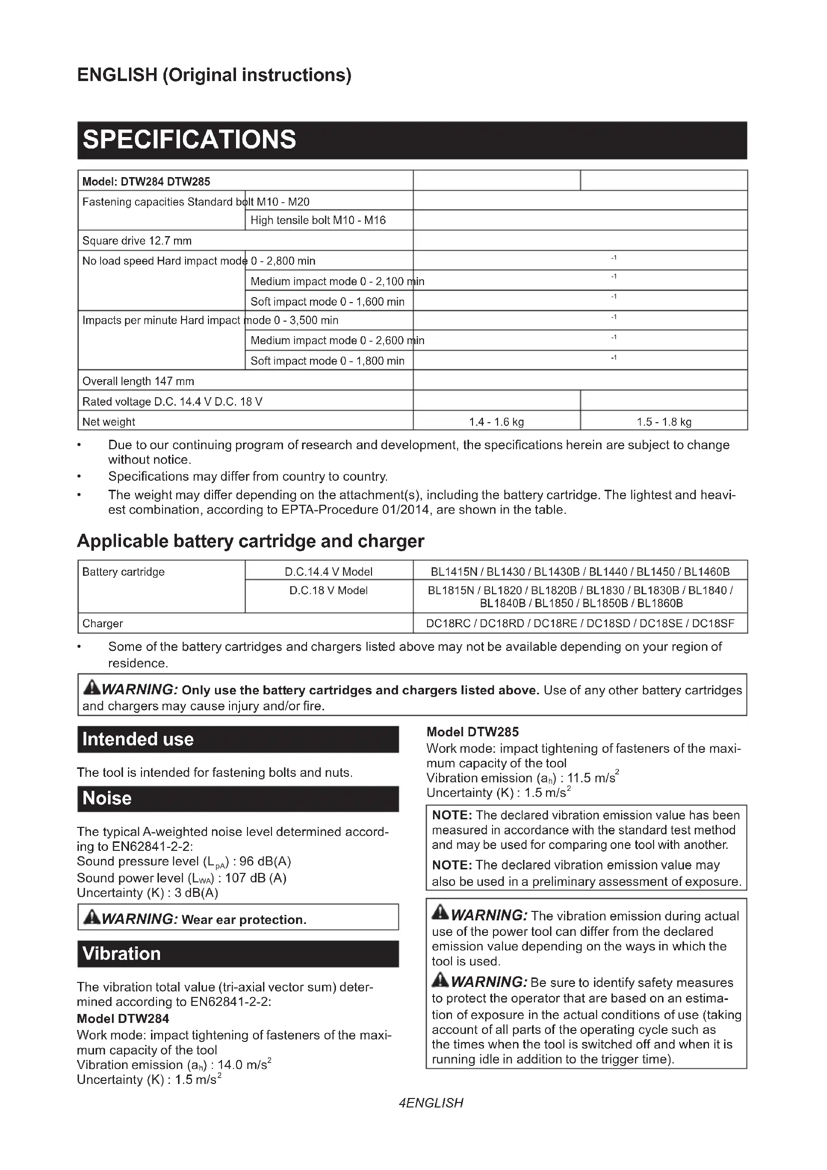 - Theweightmaydifferdependingontheattachment(s),includingthebatterycartridge.Thelightestandheavi- est combination, according to EPTA-Procedure 01/2014, are shown in the table. Applicable battery cartridge and charger Batterycartridge D.C.14.4 V Model BL1415N / BL1430 / BL1430B / BL1440 / BL1450 / BL1460B D.C.18 V Model BL1815N / BL1820 / BL1820B / BL1830 / BL1830B / BL1840 / BL1840B / BL1850 / BL1850B / BL1860B Charger DC18RC / DC18RD / DC18RE / DC18SD / DC18SE / DC18SF