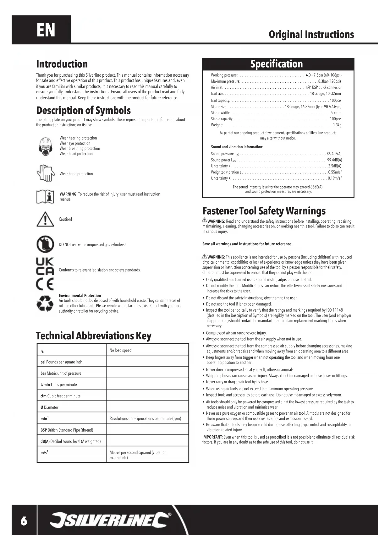 - .55m/s Uncertainty K: .19m/s The sound intensity level for the operator may exceed 85dB(A) and sound protection measures are necessary. Specication Fastener Tool Safety Warnings WARNING: Read and understand the safety instructions before installing, operating, repairing, maintaining,cleaning,changingaccessorieson,orworkingnearthistool.Failuretodosocanresultin serious injury.Save all warnings and instructions for future reference. WARNING: This appliance is not intended for use by persons (including children) with reduced physical or mental capabilities or lack of experience or knowledge unless they have been given supervision or instruction concerning use of the tool by a person responsible for their safety. Children must be supervised to ensure that they do not play with the tool.• Onlyqualiedandtrainedusersshouldinstall,adjust,orusethetool.• Donotmodifythetool.Modicationscanreducetheeffectivenessofsafetymeasuresandincrease the risks to the user.• Do not discard the safety instructions; give them to the user.• Do not use the tool if it has been damaged.• Inspect the tool periodically to verify that the ratings and markings required by ISO 11148 (detailed in the Description of Symbols) are legibly marked on the tool. The user (and employer if appropriate) should contact the manufacturer to obtain replacement marking labels when necessary.• Compressed air can cause severe injury.• Always disconnect the tool from the air supply when not in use.• Always disconnect the tool from the compressed air supply before changing accessories, making adjustments and/or repairs and when moving away from an operating area to a different area.• Keepngersawayfromtriggerwhennotoperatingthetoolandwhenmovingfromoneoperating position to another.• Never direct compressed air at yourself, others or animals.• Whippinghosescancausesevereinjury.Alwayscheckfordamagedorloosehosesorttings.• Never carry or drag an air tool by its hose.• When using air tools, do not exceed the maximum operating pressure.• Inspect tools and accessories before each use. Do not use if damaged or excessively worn.• Air tools should only be powered by compressed air at the lowest pressure required by the task to reduce noise and vibration and minimise wear.• Never use pure oxygen or combustible gases to power an air tool. Air tools are not designed for thesepowersourcesandtheirusecreatesareandexplosionhazard.• Be aware that air tools may become cold during use, affecting grip, control and susceptibility to vibration-related injury. IMPORTANT: Even when this tool is used as prescribed it is not possible to eliminate all residual risk factors. If you are in any doubt as to the safe use of this tool, do not use it. Introduction Thank you for purchasing this Silverline product. This manual contains information necessary for safe and effective operation of this product. This product has unique features and, even if you are familiar with similar products, it is necessary to read this manual carefully to ensure you fully understand the instructions. Ensure all users of the product read and fully understand this manual. Keep these instructions with the product for future reference. Description of Symbols The rating plate on your product may show symbols. These represent important information about the product or instructions on its use.Wear hearing protection Wear eye protection Wear breathing protection Wear head protectionWear hand protectionWARNING: To reduce the risk of injury, user must read instruction manual Caution! DO NOT use with compressed gas cylinders!Conforms to relevant legislation and safety standards. Environmental Protection Air tools should not be disposed of with household waste. They contain traces of oil and other lubricants. Please recycle where facilities exist. Check with your local authority or retailer for recycling advice. Technical Abbreviations Key p. 0