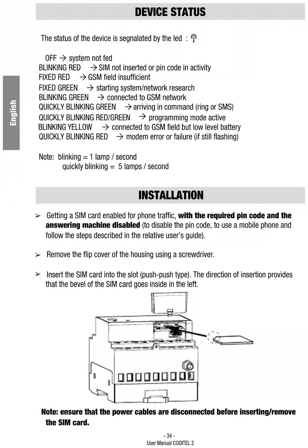 Insert the SIM card into the slot (push-push type). The direction of insertion provides that the bevel of the SIM card goes inside in the left. Note: ensure that the power cables are disconnected before inserting/remove the SIM card.English