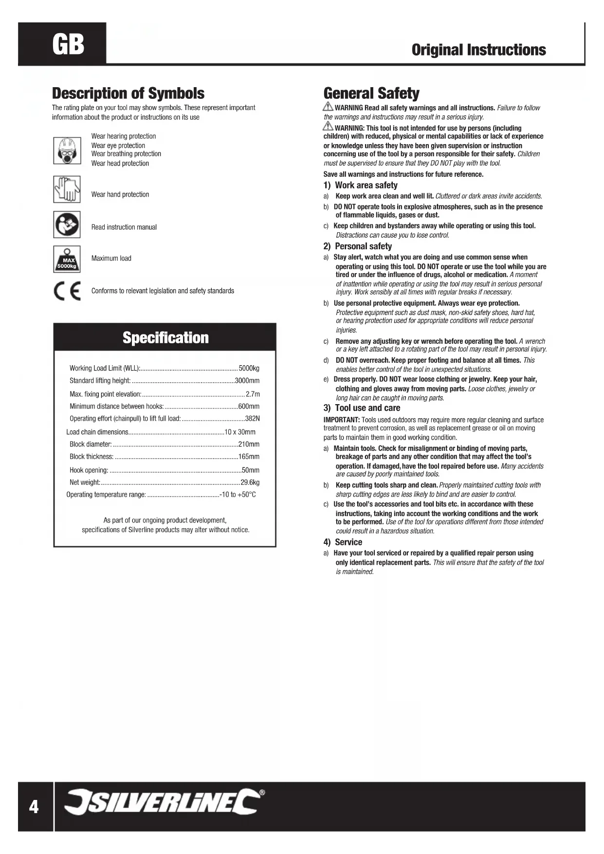 - Additional lifting equipment and accessories, including lifting slings, are available from your Silverline stockist Maintenance Note: All lifting equipment must be regularly inspected and maintained by a competent person, in accordance with local laws and regulations (e.g. Lifting Equipment Regulations, etc.). Maintenance must be recorded in a dedicated service record (see end of this manual). WARNING: Carry out a visual inspection of all components, every time the chain block is used, and listen for any unusual sounds during operation. Perform an in-depth examination every time the device has not been used for some time. Should any damage be detected, remove the device from service immediately, and return it to an authorised Silverline service centre for repairs. If the device is beyond repair, it must be rendered unusable and discarded. WARNING: Inspect and test the brake mechanism before every use. WARNING: This tool does not contain any user-serviceable parts. Never disassemble the chain block. Always return the device to an authorised Silverline service centre for maintenance and repairs. Cleaning