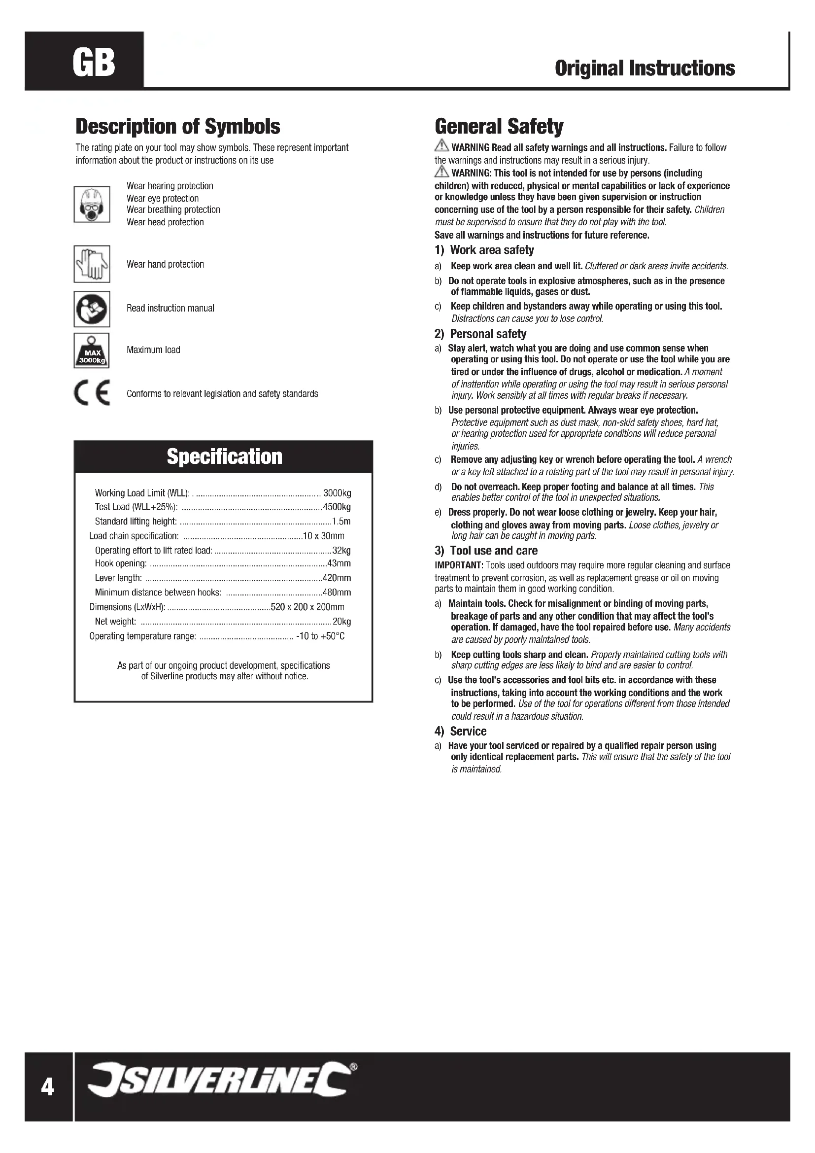 Description of Symbols The rating plate on your tool may show symbols. These represent important information about the product or instructions on its use Wear hearing protection Wear eye protectionWear breathing protectionWear head protectionWear hand protectionRead instruction manualMaximum loadConforms to relevant legislation and safety standards Specification Working Load Limit (WLL): . ...................................................... 3000kg Test Load (WLL+25%): .............................................................4500kg Standard lifting height: ..................................................................1.5m Load chain specification: ....................................................10 x 30mm Operating effort to lift rated load: ...................................................32kg Hook opening: .............................................................................43mm Lever length: .............................................................................420mm Minimum distance between hooks: ..........................................480mm Dimensions (LxWxH): .............................................520 x 200 x 200mm Net weight: ...................................................................................20kg Operating temperature range: ......................................... -10 to +50°CAs part of our ongoing product development, specifications of Silverline products may alter without notice. General Safety WARNING Read all safety warnings and all instructions. Failure to follow the warnings and instructions may result in a serious injury. WARNING: This tool is not intended for use by persons (including children) with reduced, physical or mental capabilities or lack of experience or knowledge unless they have been given supervision or instruction concerning use of the tool by a person responsible for their safety. Children must be supervised to ensure that they do not play with the tool.Save all warnings and instructions for future reference.
