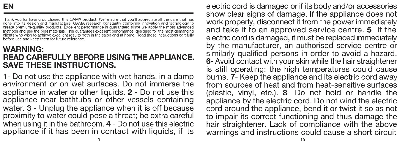 Dopo l’utilizzo, staccare il cavo di alimentazione e riporlo in luogo asciutto una volta raffreddato. Non arrotolare il cavo all’apparecchio. Non appendere mai l’apparecchio per il cavo, ma servirsi dell’apposito anello. Sul sito www.gamaprofessional.com puoi trovare i manuali di prodotto e le avvertenze. 7 8EN Thank you for having purchased this GAMA product. We’re sure that you’ll appreciate all the care that has gone into its design and manufacture. GAMA research constantly combines innovation and technology to create premium-quality products. Excellent performance is guaranteed since we apply the most advanced methods and use the best materials. This guarantees excellent performance, designed for the most demanding clients who wish to achieve excellent results both in the salon and at home. Read these instructions carefully before use and keep them for future reference.