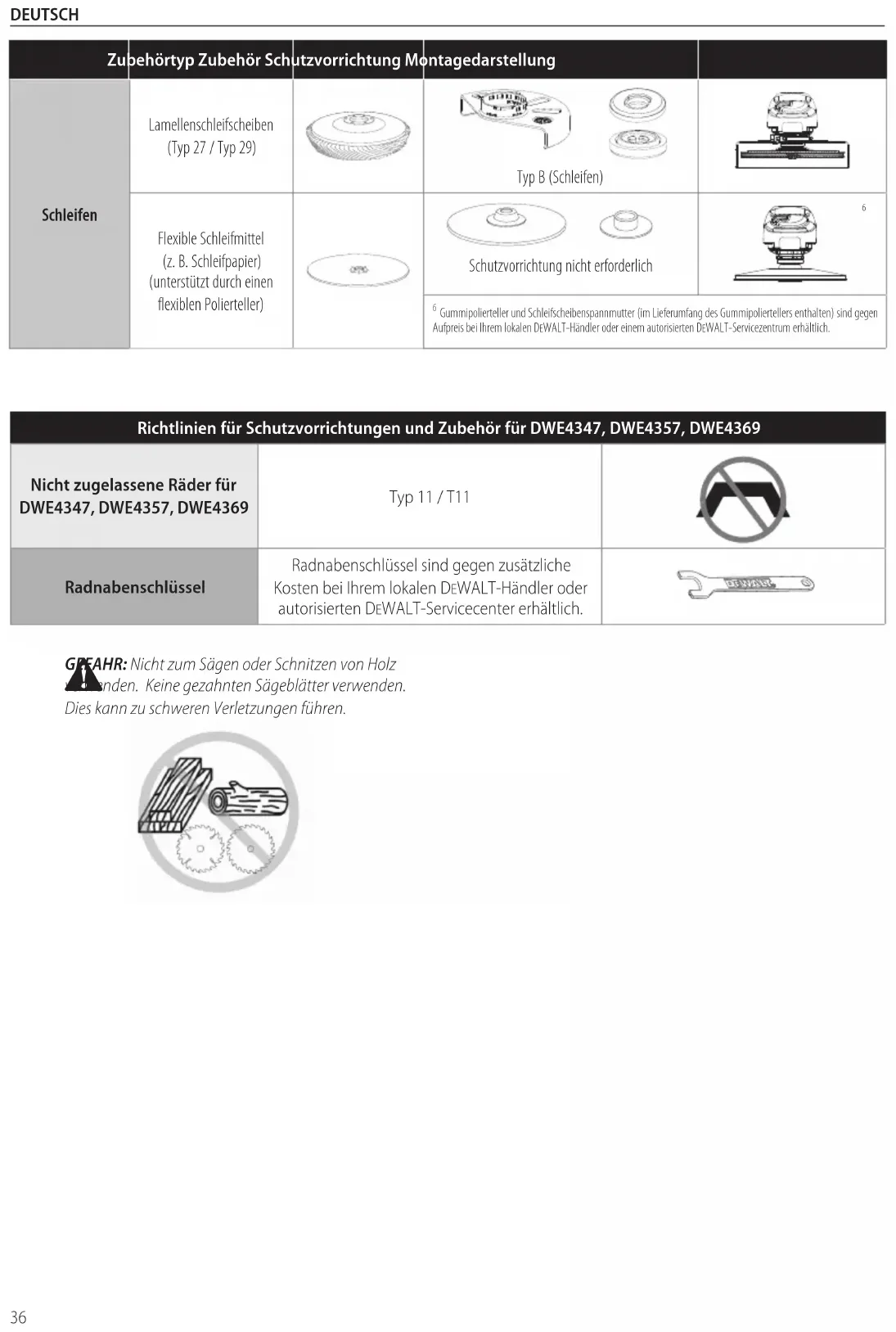 Do not use toothed blades of any kind. Serious injury canresult. Application Accessory Type Accessory Guard Assembly for Reference Sanding Flap Disc (Type 27 / Type 29) Type B (Grinding) Flexible Abrasive (e.g. sandpaper) (supported by a flexible backing pad) Guard not required