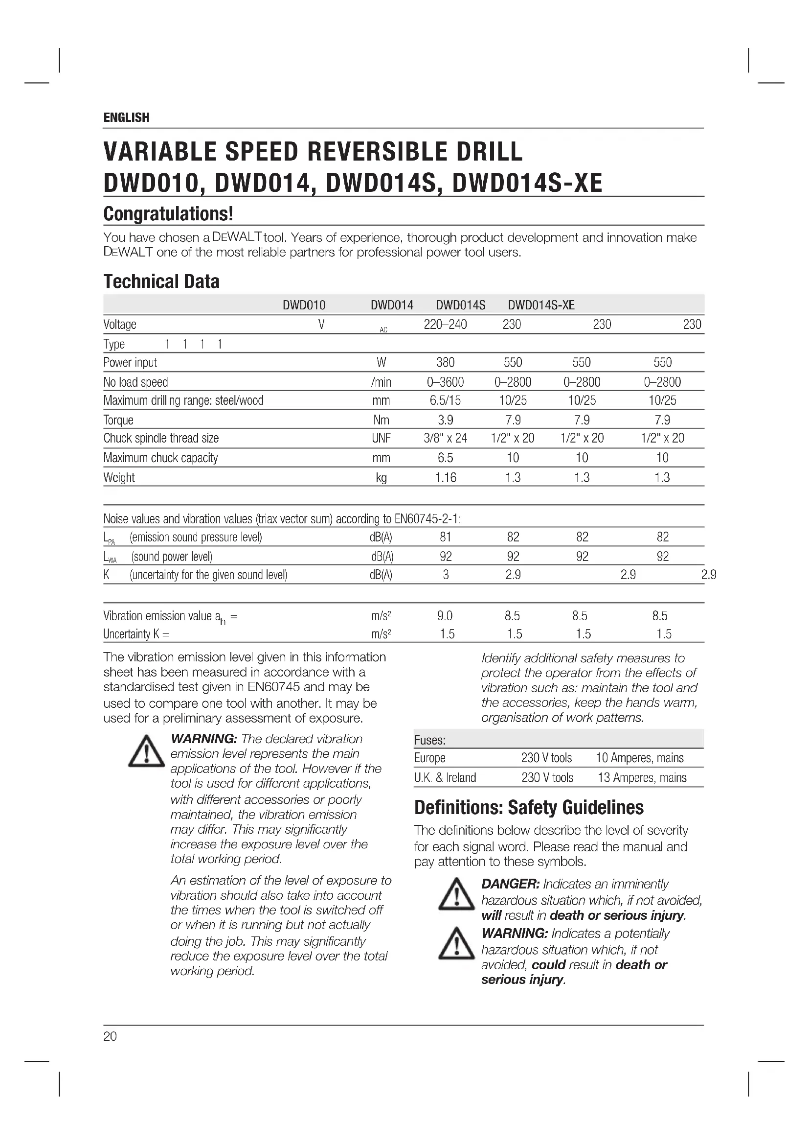 emission level represents the main applications of the tool. However if the tool is used for different applications, with different accessories or poorly maintained, the vibration emission may differ. This may significantly increase the exposure level over the total working period. An estimation of the level of exposure to vibration should also take into account the times when the tool is switched off or when it is running but not actually doing the job. This may significantly reduce the exposure level over the total working period. Identify additional safety measures to protect the operator from the effects of vibration such as: maintain the tool and the accessories, keep the hands warm, organisation of work patterns. Fuses: Europe 230 V tools 10 Amperes, mains U.K. & Ireland 230 V tools 13 Amperes, mains Definitions: Safety Guidelines The definitions below describe the level of severity for each signal word. Please read the manual and pay attention to these symbols.