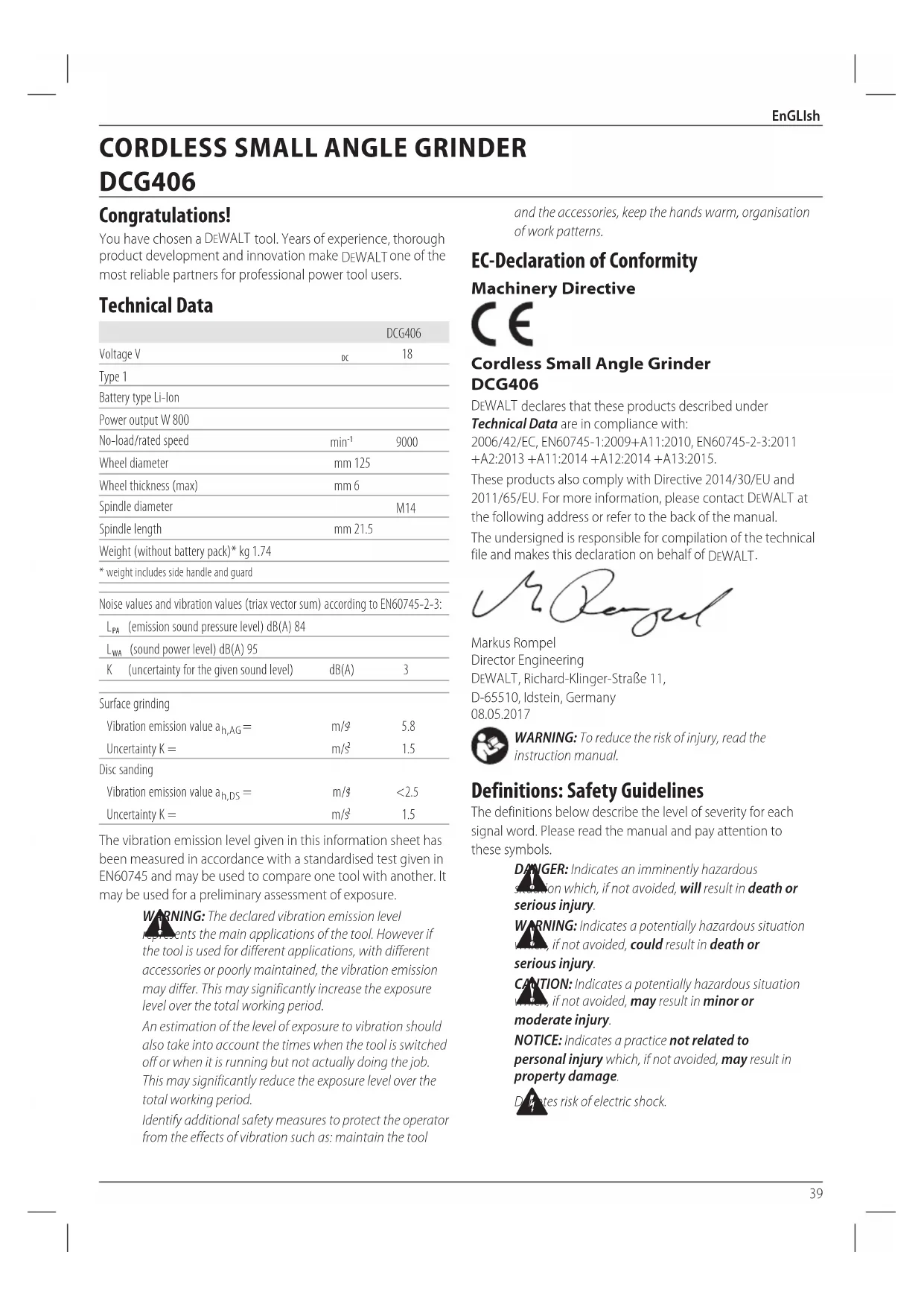 Download the instructions for your Sander in PDF format for free! Find your manual DCG406 - DEWALT and take your electronic device back in hand. On this page are published all the documents necessary for the use of your device. DCG406 by DEWALT.