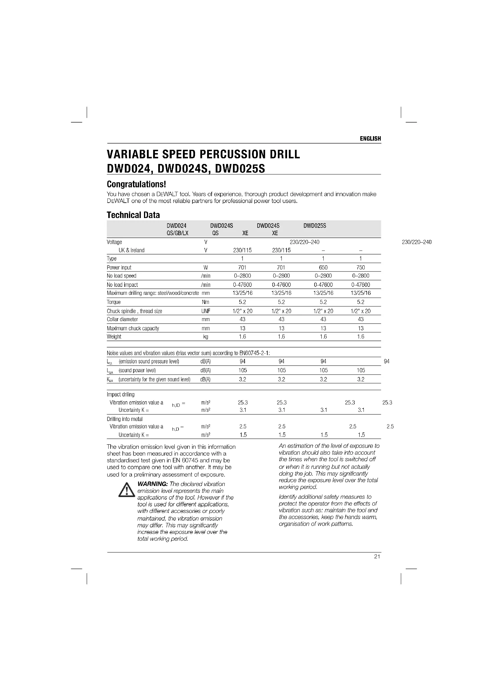 DWD024, DWD024S, DWD024S-XE, DWD025S-XE DEWALT declares that these products described under Technical Data are in compliance with: 2006/42/EC, EN60745-1:2009 +A11:2010, EN60745-2-1:2010. These products also comply with Directive 2004/108/EC (until 19.04.2016), 2014/30/EU (from