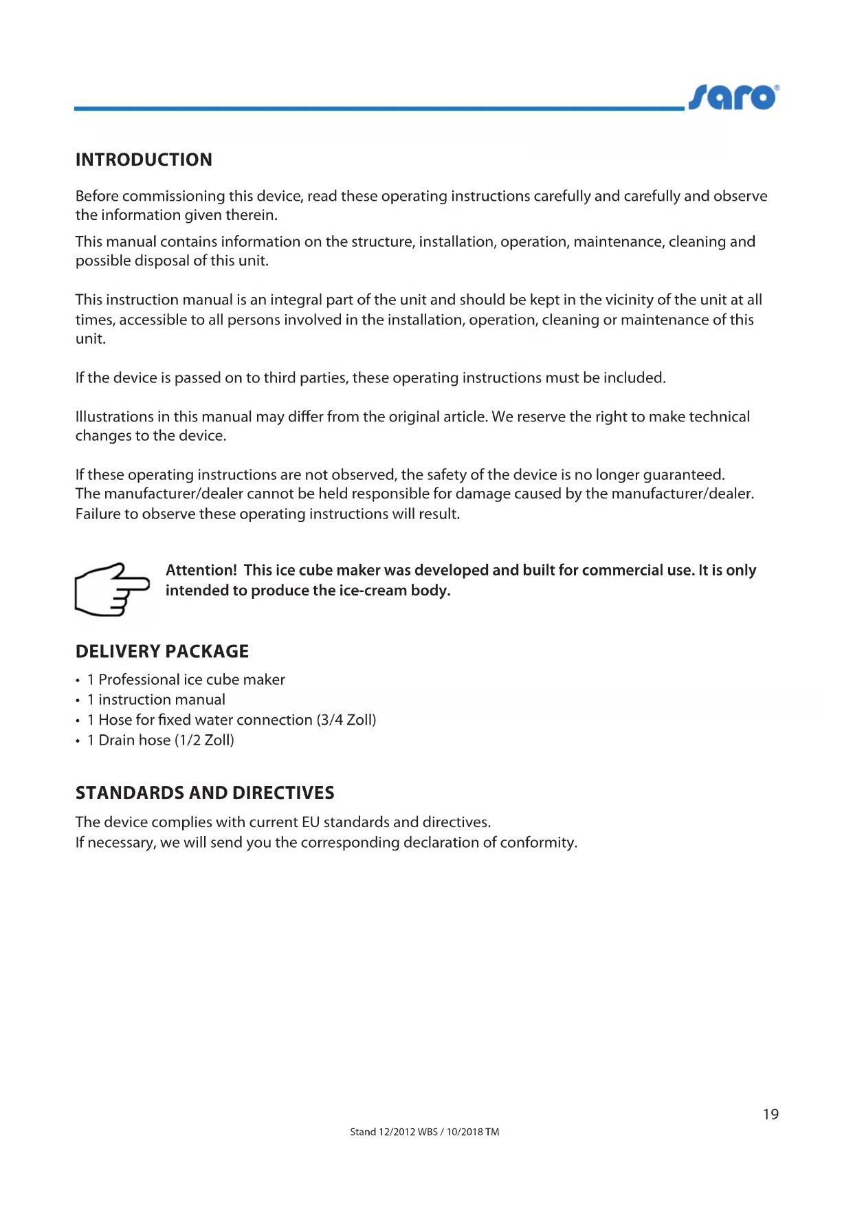 The device complies with current EU standards and directives. If necessary, we will send you the corresponding declaration of conformity. Attention! This ice cube maker was developed and built for commercial use It is only intended to produce the ice-cream body20 Stand 12/2012 WBS / 10/2018 TM