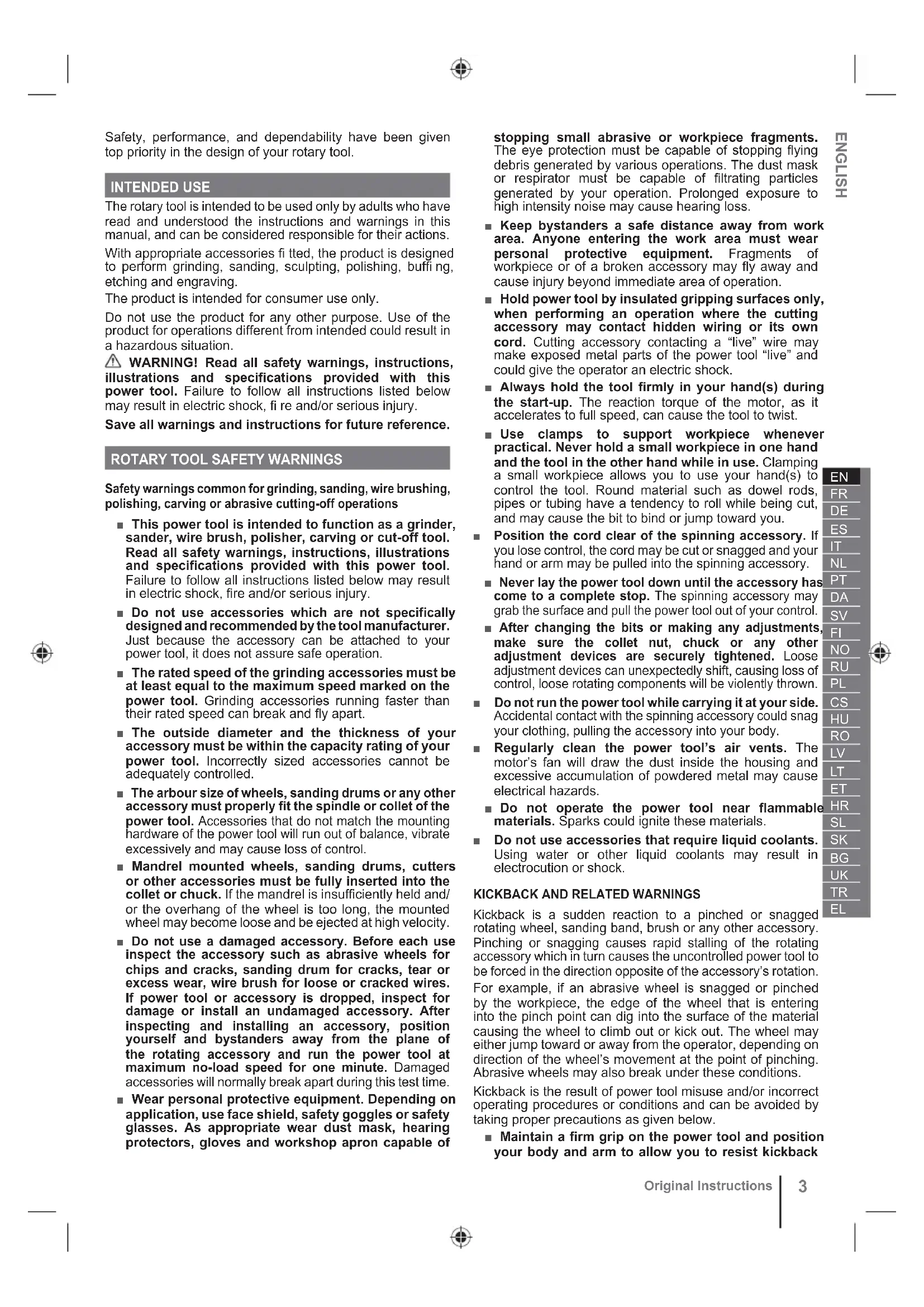 Original Instructionsforces. The operator can control kickback forces, if proper precautions are taken. ■ Use special care when working corners, sharp edges etc. Avoid bouncing and snagging the accessory. Corners, sharp edges or bouncing have a tendency to snag the rotating accessory and cause loss of control or kickback. ■ Do not attach a toothed saw blade. Such blades create frequent kickback and loss of control. ■ Always feed the bit into the material in the same direction as the cutting edge is exiting from the material (which is the same direction as the chips are thrown). Feeding the tool in the wrong direction causes the cutting edge of the bit to climb out of the work and pull the tool in the direction of this feed. ■ When using rotary files, cut-off wheels, high-speed cutters or tungsten carbide cutters, always have the work securely clamped. These wheels will grab if they become slightly canted in the groove, and can kickback. When a cut- off wheel grabs, the wheel itself usually breaks. When a rotary file, high-speed cutter or tungsten carbide cutter grabs, it may jump from the groove and you could lose control of the tool. Safety warnings specifi c for grinding and abrasive cutting-off operations ■ Use only wheel types that are recommended for your power tool and only for recommended applications. For example: do not grind with the side of a cut-off wheel. Abrasive cut-off wheels are intended for peripheral grinding, side forces applied to these wheels may cause them to shatter. ■ For threaded abrasive cones and plugs use only undamaged wheel mandrels with an unrelieved shoulder flange that are of correct size and length. Proper mandrels will reduce the possibility of breakage. ■ Do not “jam” a cut-off wheel or apply excessive pressure. Do not attempt to make an excessive depth of cut. Overstressing the wheel increases the loading and susceptibility to twisting or snagging of the wheel in the cut and the possibility of kickback or wheel breakage. ■ Do not position your hand in line with and behind the rotating wheel. When the wheel, at the point of operation, is moving away from your hand, the possible kickback may propel the spinning wheel and the power tool directly at you. ■ When wheel is pinched, snagged or when interrupting a cut for any reason, switch off the power tool and hold the power tool motionless until the wheel comes to a complete stop. Never attempt to remove the cut-off wheel from the cut while the wheel is in motion otherwise kickback may occur. Investigate and take corrective action to eliminate the cause of wheel pinching or snagging. ■ Do not restart the cutting operation in the workpiece. Let the wheel reach full speed and carefully re-enter the cut. The wheel may bind, walk up or kickback if the power tool is restarted in the workpiece. ■ Support panels or any oversized workpiece to minimize the risk of wheel pinching and kickback. Large workpieces tend to sag under their own weight. Supports must be placed under the workpiece near the line of cut and near the edge of the workpiece on both sides of the wheel. ■ Use extra caution when making a “pocket cut” into existing walls or other blind areas. The protruding wheel may cut gas or water pipes, electrical wiring or objects that can cause kickback. Safety warnings specifi c for wire brushing operations ■ Be aware that wire bristles are thrown by the brush even during ordinary operation. Do not overstress the wires by applying excessive load to the brush. The wire bristles can easily penetrate light clothing and/or skin. ■ Allow brushes to run at operating speed for at least one minute before using them. During this time no one is to stand in front or in line with the brush. Loose bristles or wires will be discharged during the run-in time. ■ Direct the discharge of the spinning wire brush away from you. Small particles and tiny wire fragments may be discharged at high velocity during the use of these brushes and may become imbedded in your skin.