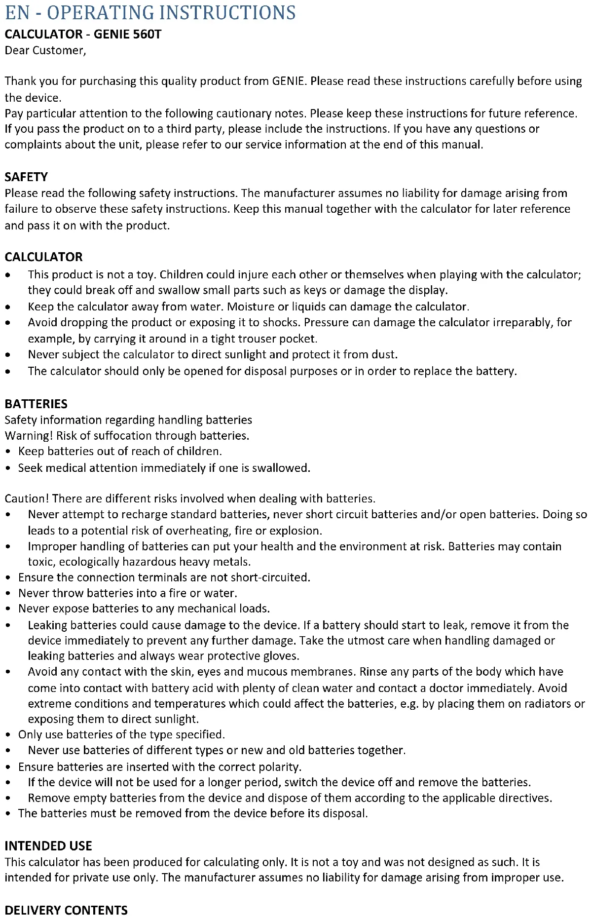 - The batteries must be removed from the device before its disposal. INTENDED USE This calculator has been produced for calculating only. It is not a toy and was not designed as such. It is intended for private use only. The manufacturer assumes no liability for damage arising from improper use. DELIVERY CONTENTSCalculator including 1x battery LR54 (L1130). Operating instructions