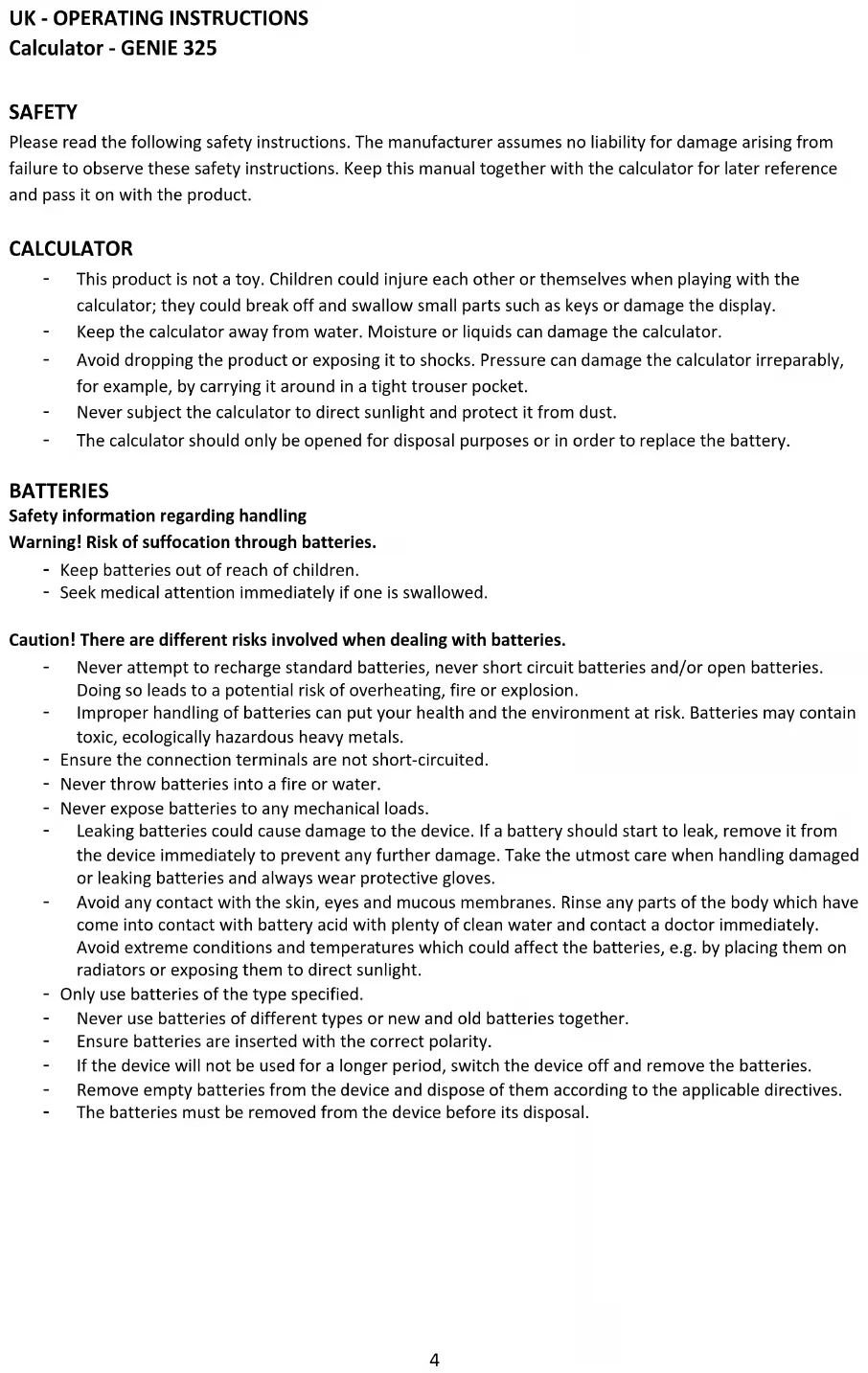Calculator - GENIE 325 SAFETY Please read the following safety instructions. The manufacturer assumes no liability for damage arising from failure to observe these safety instructions. Keep this manual together with the calculator for later reference and pass it on with the product. CALCULATOR - This product is not a toy. Children could injure each other or themselves when playing with the calculator; they could break off and swallow small parts such as keys or damage the display. - Keep the calculator away from water. Moisture or liquids can damage the calculator. - Avoid dropping the product or exposing it to shocks. Pressure can damage the calculator irreparably, for example, by carrying it around in a tight trouser pocket. - Never subject the calculator to direct sunlight and protect it from dust. - The calculator should only be opened for disposal purposes or in order to replace the battery.