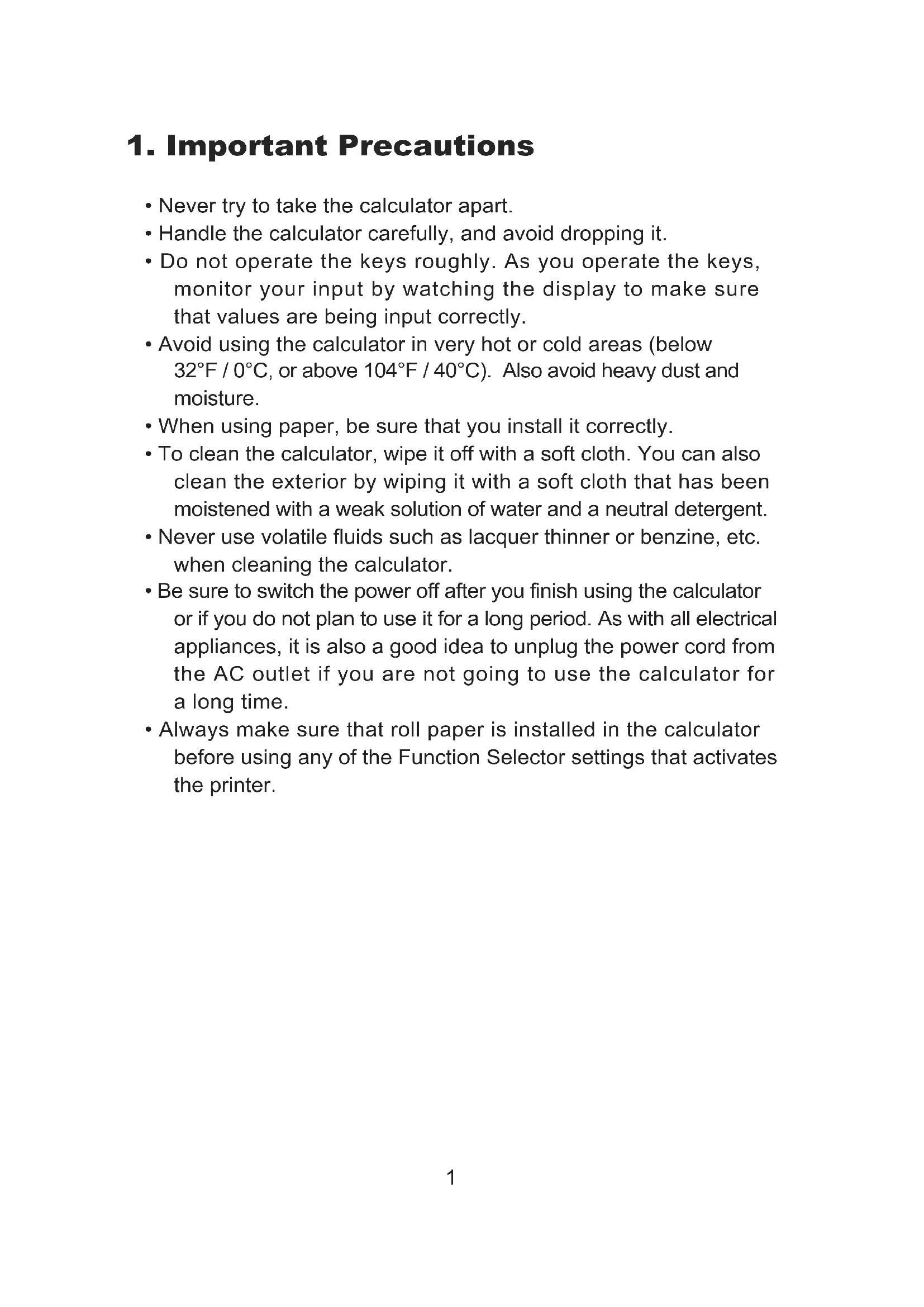 - Never use volatile fluids such as lacquer thinner or benzine, etc. when cleaning the calculator.