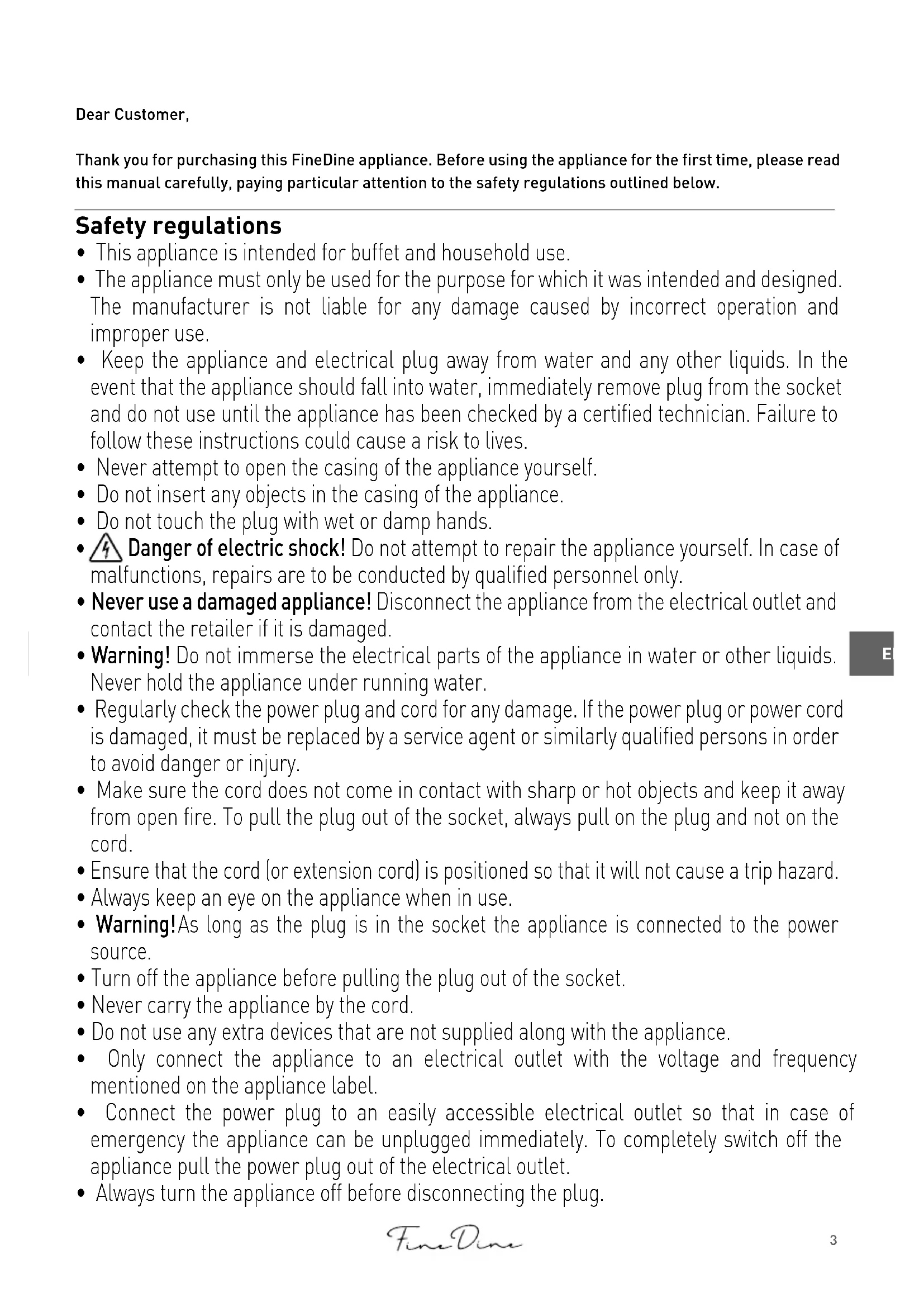 - Keep the appliance and electrical plug away from water and any other liquids. In the event that the appliance should fall into water, immediately remove plug from the socket and do not use until the appliance has been checked by a certified technician. Failure to follow these instructions could cause a risk to lives.