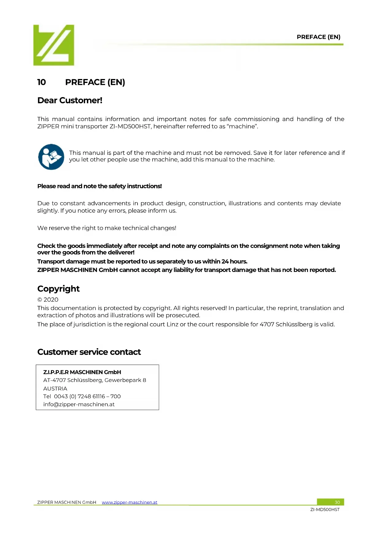 Please read and note the safety instructions! Due to constant advancements in product design, construction, illustrations and contents may deviate slightly. If you notice any errors, please inform us. We reserve the right to make technical changes! Check the goods immediately after receipt and note any complaints on the consignment note when taking over the goods from the deliverer! Transport damage must be reported to us separately to us within 24 hours. ZIPPER MASCHINEN GmbH cannot accept any liability for transport damage that has not been reported. Copyright © 2020 This documentation is protected by copyright. All rights reserved! In particular, the reprint, translation and extraction of photos and illustrations will be prosecuted. The place of jurisdiction is the regional court Linz or the court responsible for 4707 Schlüsslberg is valid.