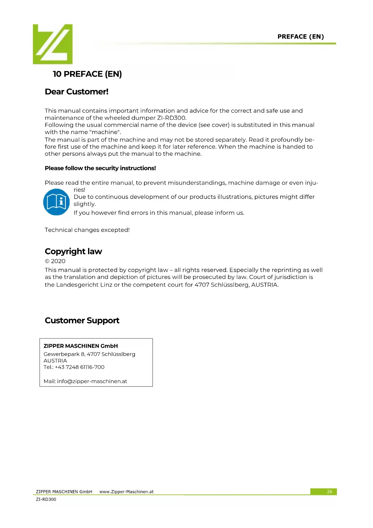 HINWEIS Sollten sie sich bei notwendigen Reparaturen nicht in der Lage fühlen diese ord- nungsgemäß zu verrichten, oder besitzen sie die vorgeschriebene Ausbildung dafür nicht, ziehen sie immer eine Fachwerkstätte zum Beheben des Problems hinzu.PREFACE (EN) ZIPPER MASCHINEN GmbH www.Zipper-Maschinen.at 26 ZI-RD300 10 PREFACE (EN) Dear Customer! This manual contains important information and advice for the correct and safe use and maintenance of the wheeled dumper ZI-RD300. Following the usual commercial name of the device (see cover) is substituted in this manual with the name "machine". The manual is part of the machine and may not be stored separately. Read it profoundly be- fore first use of the machine and keep it for later reference. When the machine is handed to other persons always put the manual to the machine. Please follow the security instructions! Please read the entire manual, to prevent misunderstandings, machine damage or even inju- ries! Due to continuous development of our products illustrations, pictures might differ slightly. If you however find errors in this manual, please inform us. Technical changes excepted! Copyright law © 2020 This manual is protected by copyright law – all rights reserved. Especially the reprinting as well as the translation and depiction of pictures will be prosecuted by law. Court of jurisdiction is the Landesgericht Linz or the competent court for 4707 Schlüsslberg, AUSTRIA.