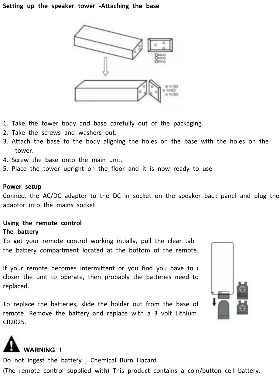 Power setup Connect the AC/DC adapter to the DC in socket on the speaker back panel and plug the adaptor into the mains socket. Using the remote control The battery To get your remote control working intially, pull the clear tab from the battery compartment located at the bottom of the remote. If your remote becomes intermittent or you find you have to move closer the unit to operate, then probably the batteries need to be replaced. To replace the batteries, slide the holder out from the base of the remote. Remove the battery and replace with a 3 volt Lithium CR2025. WARNING ! Do not ingest the battery , Chemical Burn Hazard (The remote control supplied with) This product contains a coin/button cell battery.6 If the coin/button cell battery is swallowed, it can cause severe internal burns in just 2 hours and can lead to death . Keep new and used batteries away from children. If the battery compartment does not close securely , stop using the product and keep it away from the children. If you think batteries might have been swallowed or placed inside any part of the body , seek immediate medical attention. The batteries shall not be exposed to excessive heat such as sunshine , fire or the lake. The apparatus shall not be exposed to dripping or splashing and that no objects filled with liquids , such as vases , shall be placed on the apparatus. The MAINS plug or an appliance coupler is used as the disconnect device, the disconnect device shall remain readily operable. Aux-In line in type Requires a 3.5mm cable (included)
