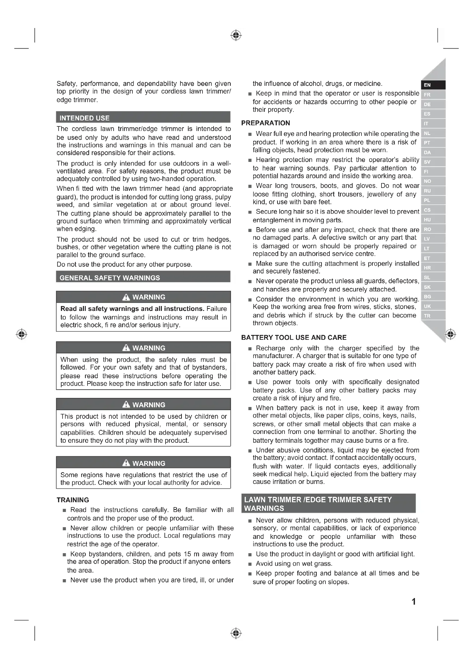 Safety, performance, and dependability have been given top priority in the design of your cordless lawn trimmer/ edge trimmer. INTENDED USE The cordless lawn trimmer/edge trimmer is intended to be used only by adults who have read and understood the instructions and warnings in this manual and can be considered responsible for their actions. The product is only intended for use outdoors in a well- ventilated area. For safety reasons, the product must be adequately controlled by using two-handed operation. When fi tted with the lawn trimmer head (and appropriate guard), the product is intended for cutting long grass, pulpy weed, and similar vegetation at or about ground level. The cutting plane should be approximately parallel to the ground surface when trimming and approximately vertical when edging. The product should not be used to cut or trim hedges, bushes, or other vegetation where the cutting plane is not parallel to the ground surface. Do not use the product for any other purpose.