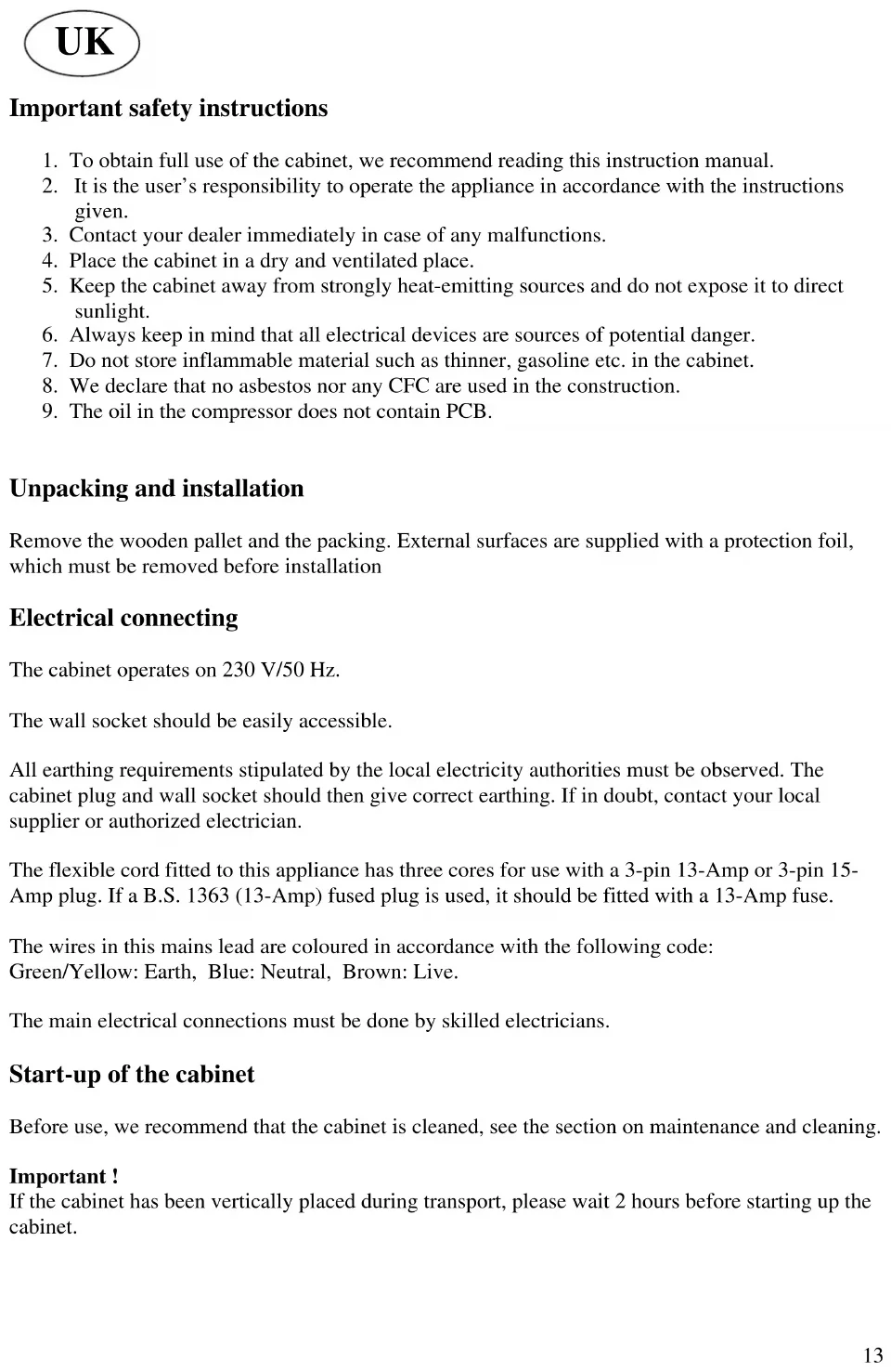 Unpacking and installation Remove the wooden pallet and the packing. External surfaces are supplied with a protection foil, which must be removed before installation Electrical connecting The cabinet operates on 230 V/50 Hz. The wall socket should be easily accessible. All earthing requirements stipulated by the local electricity authorities must be observed. The cabinet plug and wall socket should then give correct earthing. If in doubt, contact your local supplier or authorized electrician. The flexible cord fitted to this appliance has three cores for use with a 3-pin 13-Amp or 3-pin 15- Amp plug. If a B.S. 1363 (13-Amp) fused plug is used, it should be fitted with a 13-Amp fuse. The wires in this mains lead are coloured in accordance with the following code: Green/Yellow: Earth, Blue: Neutral, Brown: Live. The main electrical connections must be done by skilled electricians. Start-up of the cabinet Before use, we recommend that the cabinet is cleaned, see the section on maintenance and cleaning. Important ! If the cabinet has been vertically placed during transport, please wait 2 hours before starting up the cabinet.
