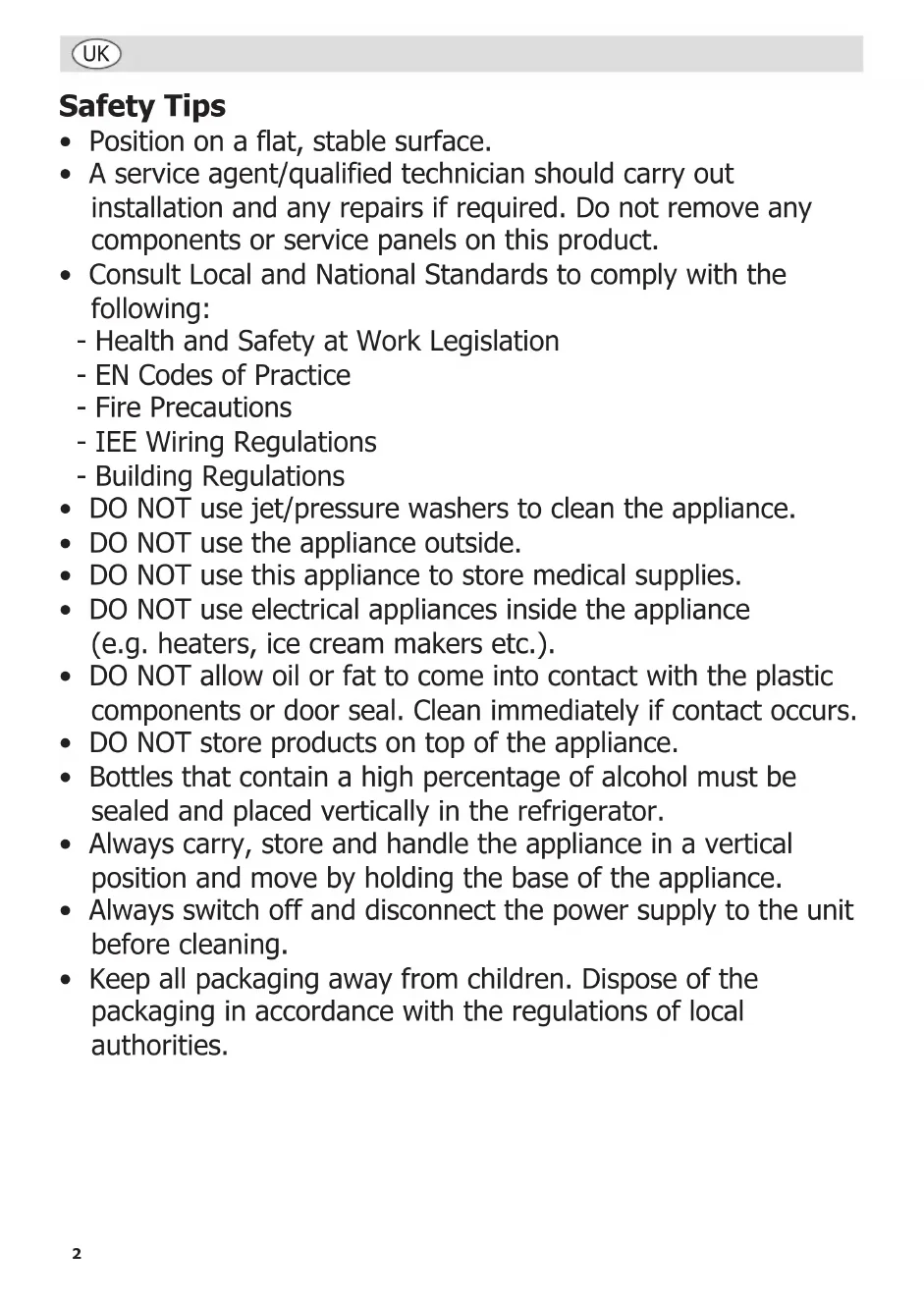 - Earth wire (coloured green/yellow) to terminal marked E All appliances must be earthed, using a dedicated earthing circuit. If in doubt consult a qualified electrician. Electrical isolation points must be kept clear of any obstructions. In the event of any emergency disconnection being required they must be readily accessible. Disposal EU regulations require refrigeration product to be disposed of by specialist companies who remove or recycle all gasses, metal and plastic components. Consult your local waste collection authority regarding disposal of your appliance. Local authorities are not obliged to dispose of commercial refrigeration equipment but may be able to offer advice on how to dispose of the equipment locally. Alternatively call the helpline for details of national disposal companies within the EU.7