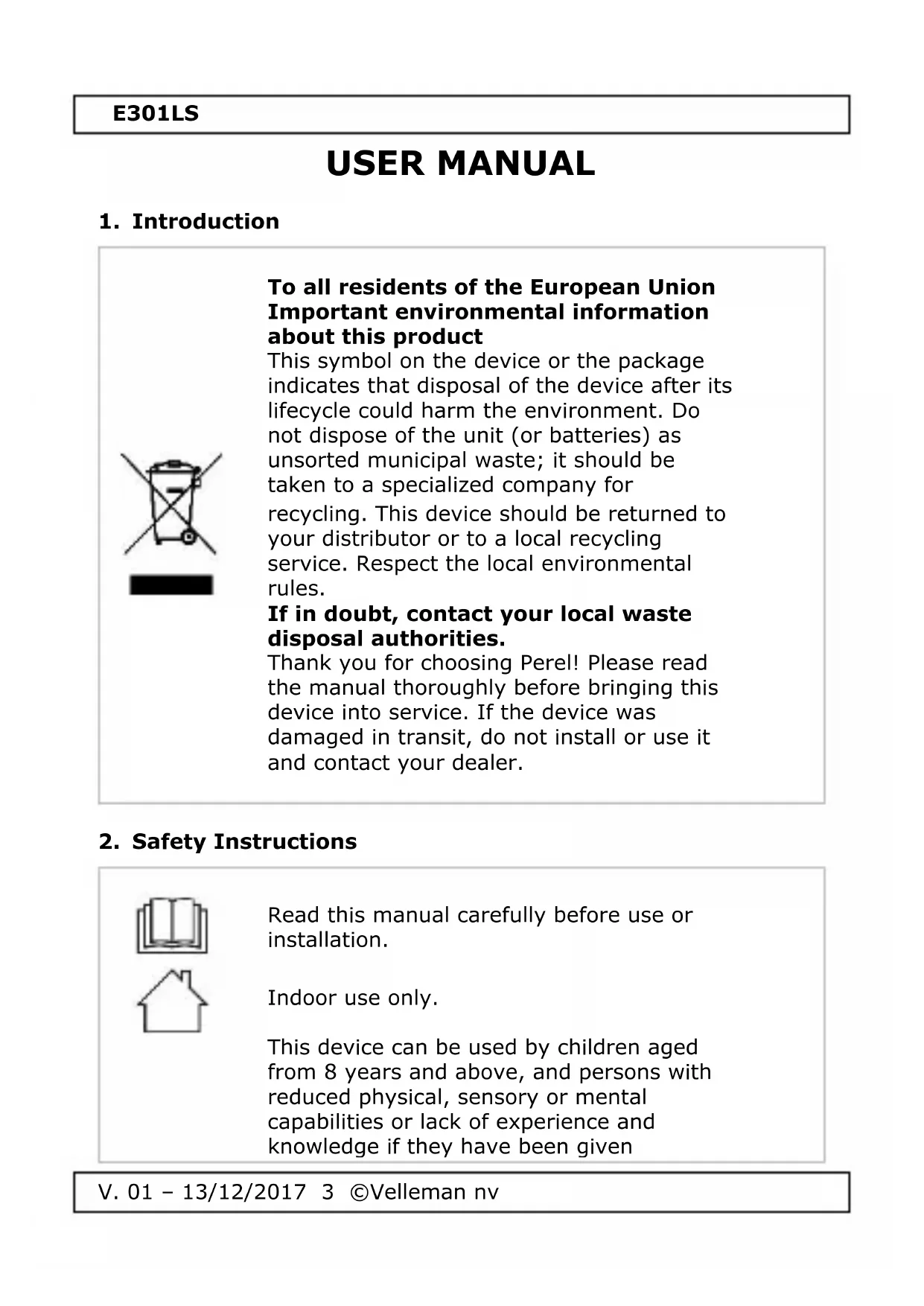 Use this device with original accessories only. Velleman nv cannot be held responsible in the event of damage or injury resulting from (incorrect) use of this device. For more info concerning this product and the latest version of this manual, please visit our website www.perel.eu. The information in this manual is subject to change without prior notice. © COPYRIGHT NOTICE The copyright to this manual is owned by Velleman nv. All worldwide rights reserved. No part of this manual may be copied, reproduced, translated or reduced to any electronic medium or otherwise without the prior written consent of the copyright holder.E301LS