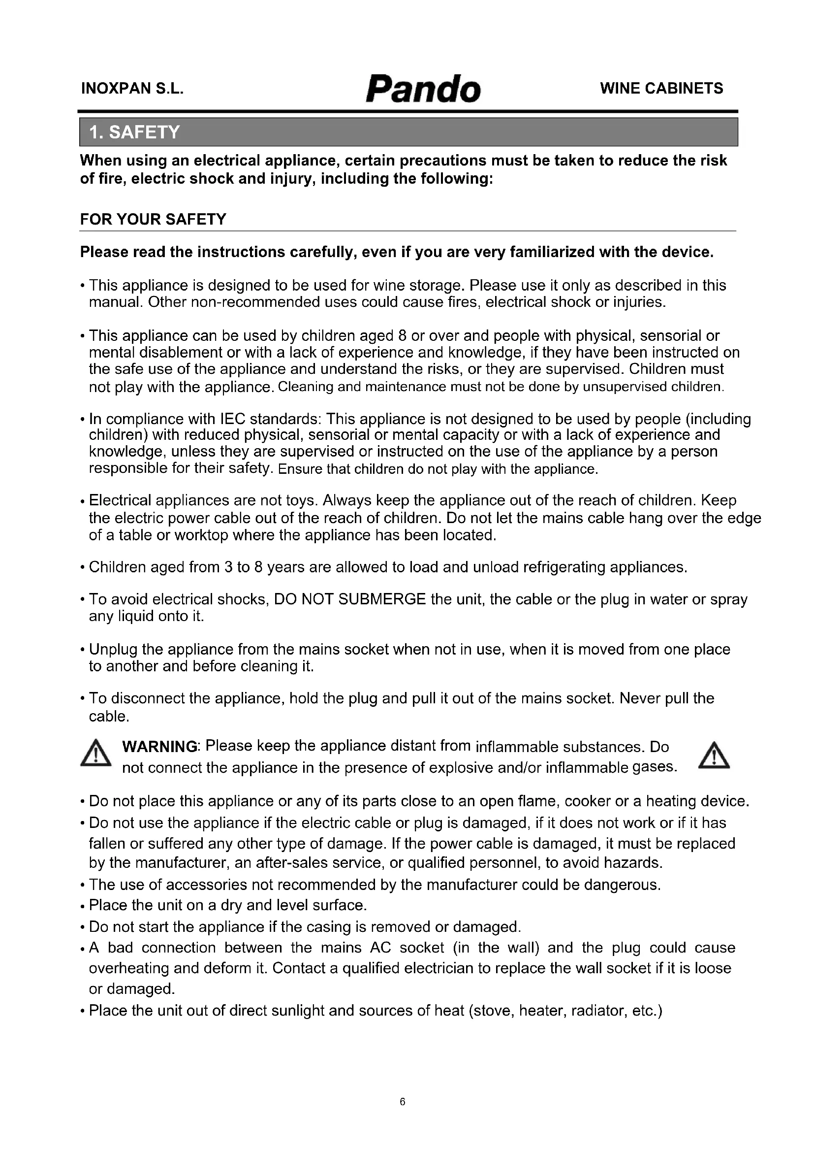 INOXPAN S.L., thank you for choosing our brand and for trusting a Pando product, standard of Quality, Design & Innovation, a brand honoring his origins and commitments. TERMS OF THIS WARRANTY: This product comes with a warranty of 3 year as from the date of purchase covering all product defect affecting its performance. To validate the same is mandatory to apply the purchasing invoice or buying ticket before the official Customer Service engineer. During the above mentioned period, the Company pledge to repair or replace at no cost any defective part whose cause is due to vice or manufacturing product flaw to make it work fine again, as well as the necessary labour cost and expenses involved in said repairing or replacement. PANDO WARRANTY EXEMPTIONS: It shall not be covered by the warranty or may be cause of cancelation of such, any of the following case scenarios, thus being the user the one taking charge of any material cost, labour and customer service travel expenses: - Installation or performing reviews, extractor hood or ducting cleaning or maintenance. - Failures or defects caused by not respecting or following the safety instructions, product use and maintenance manual recommendations. - Whenever the product is orientated to commercial or non-residential use, to which it is not made for. - Product malfunction caused by not following the instructions, recommendations and/or norms shown in the appliance manuals. - Issues arising from any unappropriated product or smoke ducting installation - Issues and faults produced by carriage or moves, and/or product handling by non-authorised personnel to this company or the brand Pando. - Bumps, dents, scratches, or broken glasses - Other alien bodies present in the interior or exterior of the product - The product or any peripheral associated device, like in-line motors- might not be accessible, either due to elements impeding easy and safe access. All necessary means to access by the Pando authorised engineer shall be on account and responsibility of the user. - Wiring inadequate handling and internal motor connections, remote or roof, and extractor hood. - Wear and tear aesthetical parts, like lighting screens, filters and lamps. - Rust, stains, tone changes produced by the use of inadequate non recommended corrosive cleaning products without the right protection, as those containing chemical corrosive agents, and /or exposure to the sea breeze (saltpetre). - Issues or malfunction produced by variations of main supply, or natural and random causes from weather or geological origin, as storms, lightning, earthquakes, floods, etc - Products whose origin is resale, used appliance, or displays with more than two years since their date of manufacturing. INOXPAN, S.L., remains expressly excluded from any liability over any eventual damage any direct or indirect to persons or materials produced by inadequate product handling and use. Official Pando Customer Service Contact Details SPAIN, PORTUGAL Y ANDORRA: